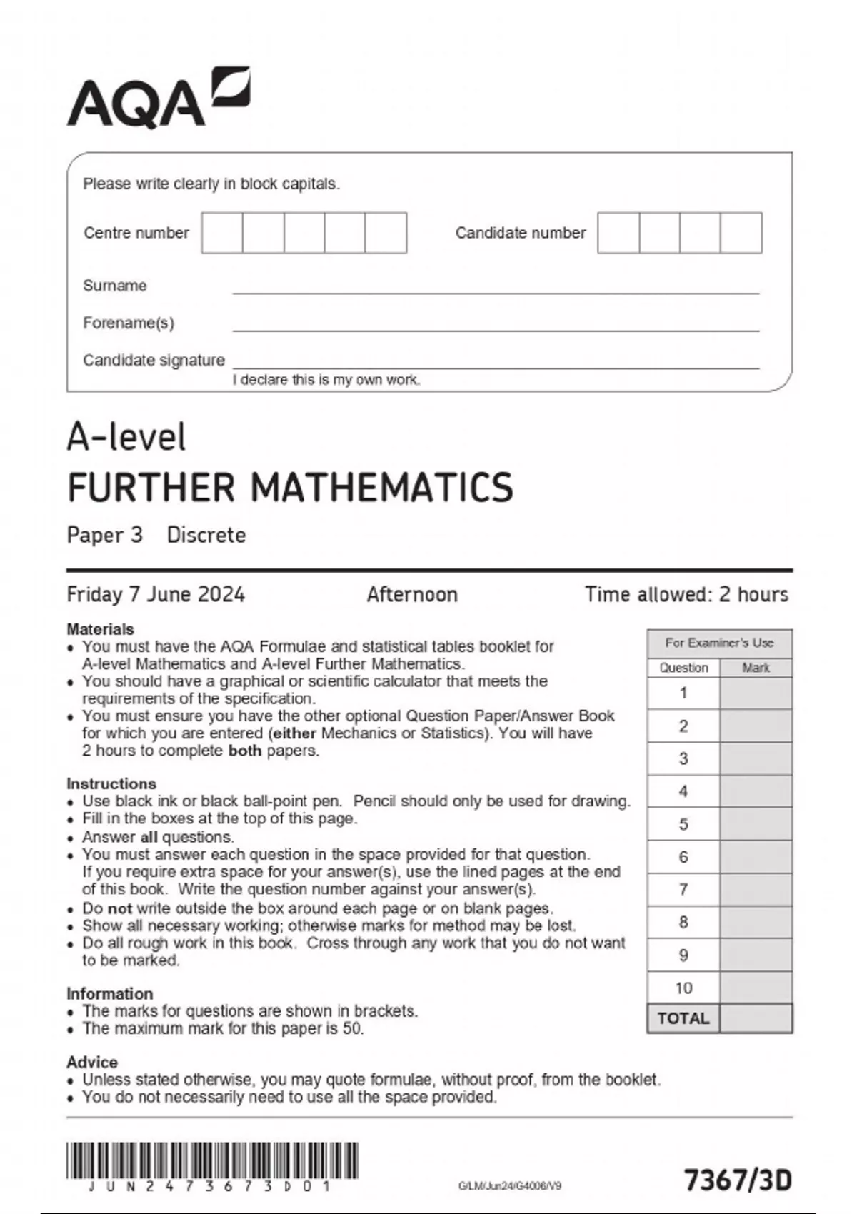 AQA A-level FURTHER MATHEMATICS Paper 3 QP Discrete Friday 7 June 2024