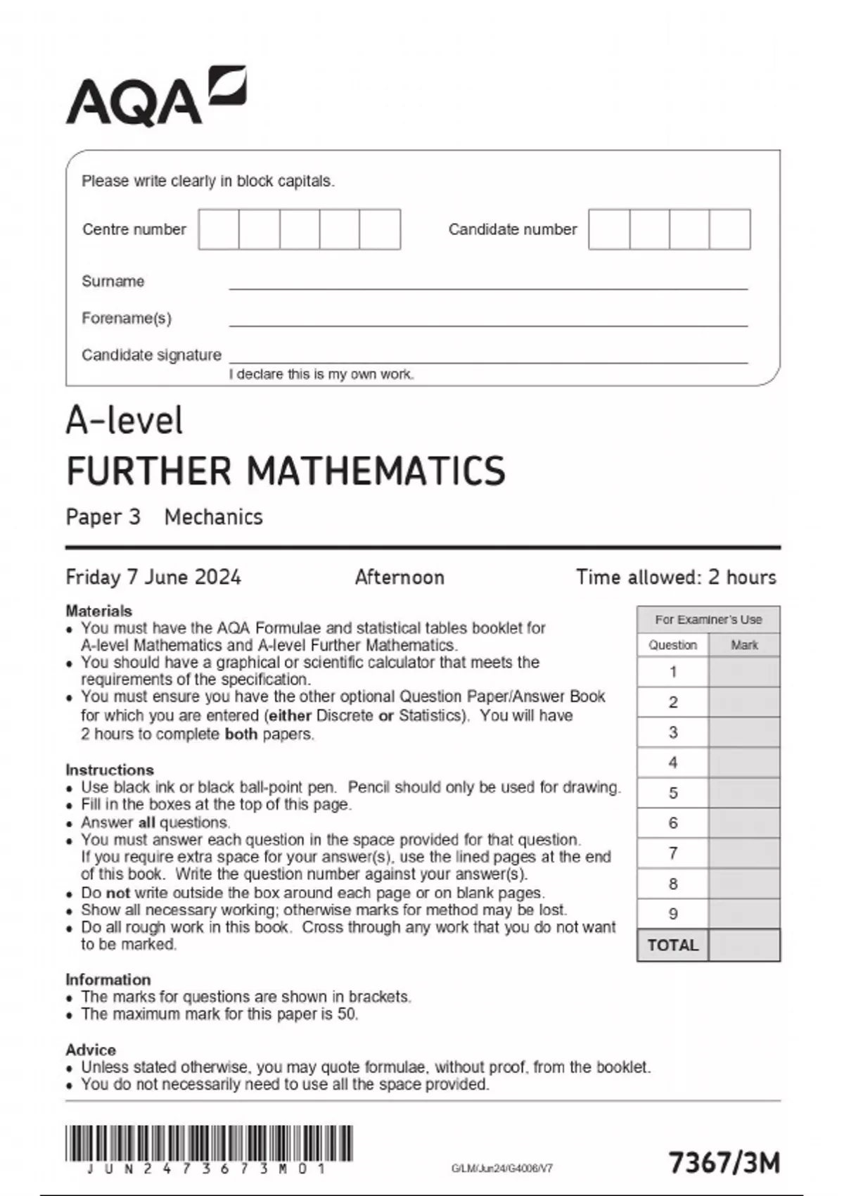AQA A-level FURTHER MATHEMATICS Paper 3 QP Mechanics Friday 7 June 2024
