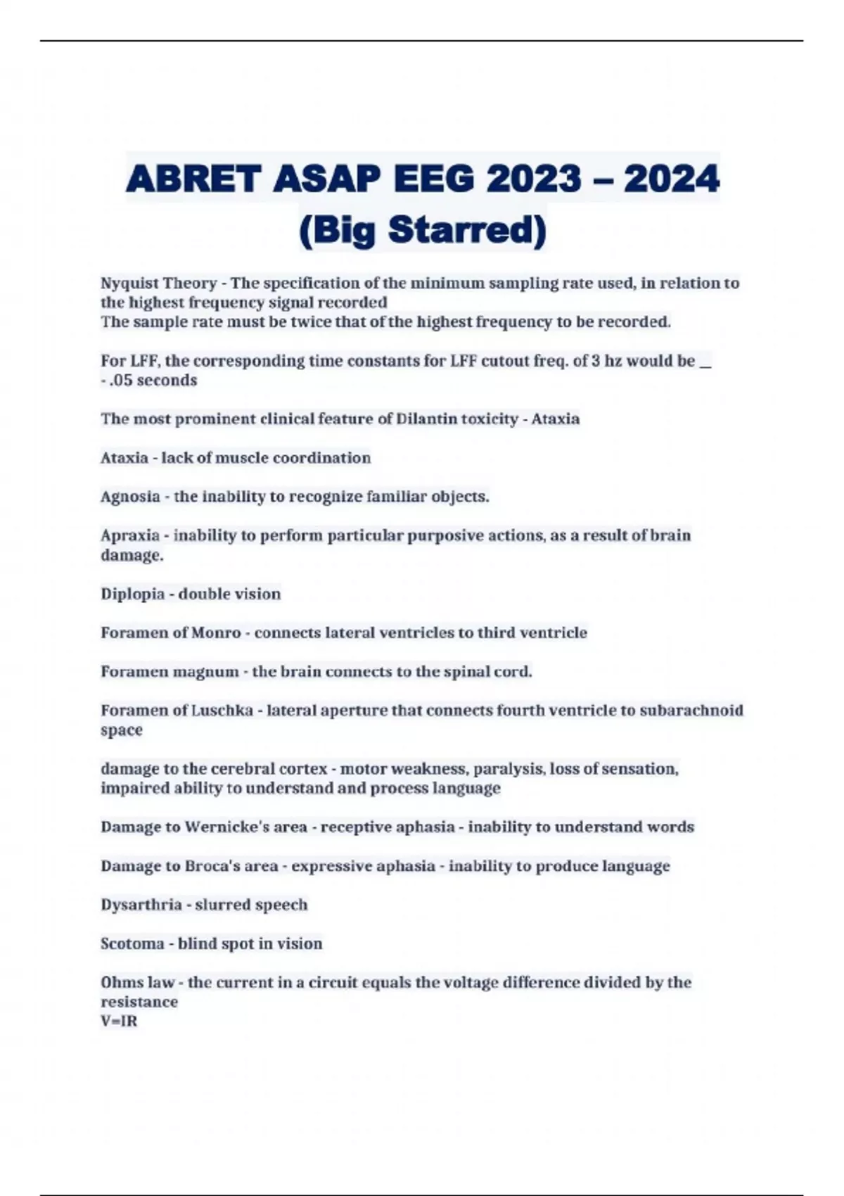 Nyquist Theory - The specification of the minimum sampling rate used, in relation to the highest frequency signal recorded The sample rate must be twice that of the highest frequency to be recorded. For LFF, the corresponding time constants for LFF cutout freq. of 3 hz would be - .05 seconds The most prominent clinical feature of Dilantin toxicity - Ataxia Ataxia - lack of muscle coordination Agnosia - the inability to recognize familiar objects. Apraxia - inability to perform particular purposive actions, as a result of brain damage. Diplopia - double vision Foramen of Monro - connects lateral ventricles to third ventricle Foramen magnum - the brain connects to the spinal cord. Foramen of Luschka - lateral aperture that connects fourth ventricle to subarachnoid space damage to the cerebral cortex - motor weakness, paralysis, loss of sensation, impaired ability to understand and process language Damage to Wernicke's area - receptive aphasia - inability to understand words Damage to Brocat s area - expressive aphasia - inability to produce language Dysarthria - slurred speech Scotoma - blind spot in vision Ohms law - the current in a circuit equals the voltage difference divided by the resistance V=IR Delta driving - Atypical photic response When the posterior background does not attenuate with eye opening - Bancaud Phenomenon Signals common to both inputs of a differential amplifier with like frequency, amplitude, and phase are: - Canceled A IFF setting of 5hz will attenuate a 5hz wave by approximately: - 0.3 Frequent movements is a characteristic of what type of sleep in neonates - active TIRDA - EEG pattern associated with seizures Rhythmic theta activity in the temporal region is most commonly associated with which seizure type: - Complex partial Saccadic eye movement - a rapid, jerky movement from one fixation to the next Lambda The pattern which disappears at the youngest conceptional age - Delta brushes The EEG of a patient with Lennox-Gastaut syndrome is most likely to show: - 1.5hz spike and wave discharges Undersampling - Aliasing A 60 year old male presents with new onset dementia nad myoclonus. What would you expect to see on the EEG - Generalized periodic epileptiform discharges Jeavon's Syndrome - Eyelid myoclonia with absences, eye closure induced seizures, EEG paroxysms and photosensitivity The 60 hz notch filter will have the greatest effect on a waveform having a duration of: - 16 msec Asychrony of sleep spindles is abnormal after: - 2 yrs Posterior Slow Waves of Youth - High voltage theta or delta waves, commonly seen in children 8-14 years, accentuated by hyperventilation Delta bursts that reappear 3 to 5 mi