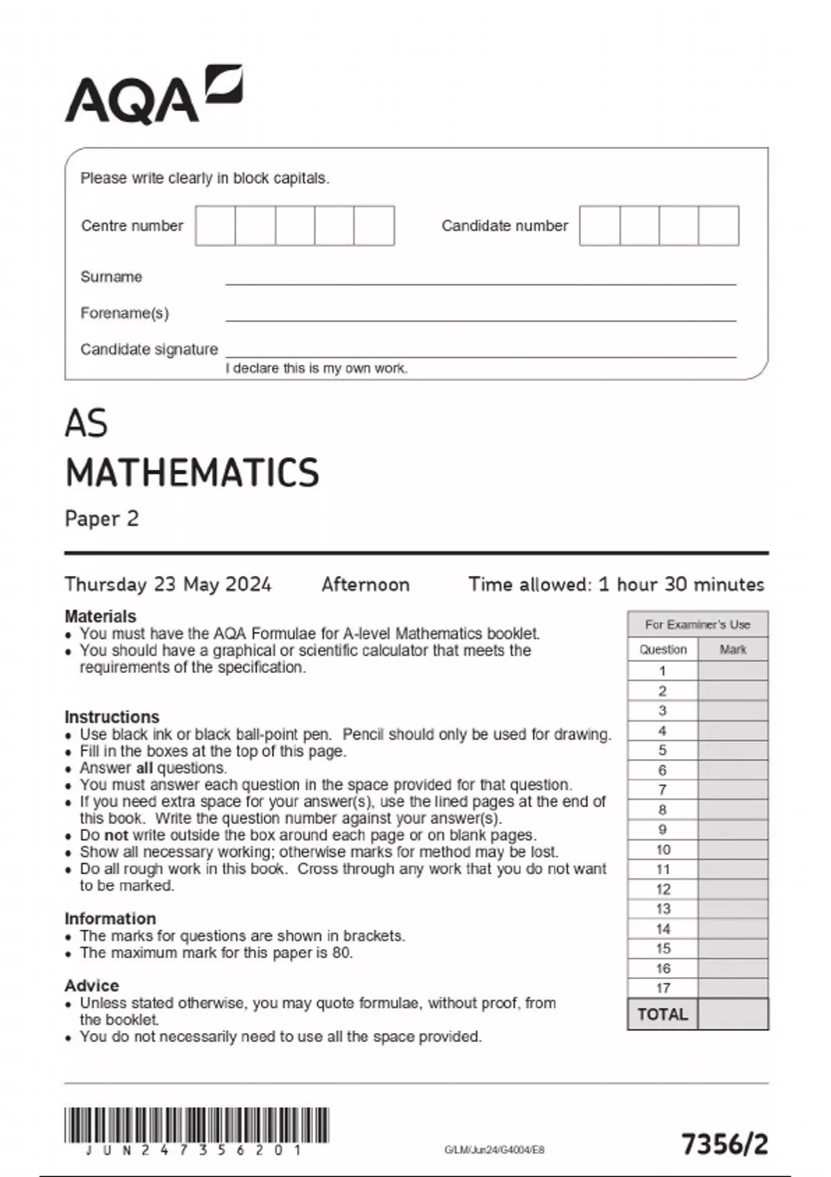 AQA AS MATHEMATICS Paper 2 7356/2 QP Mathematics AS 23May24