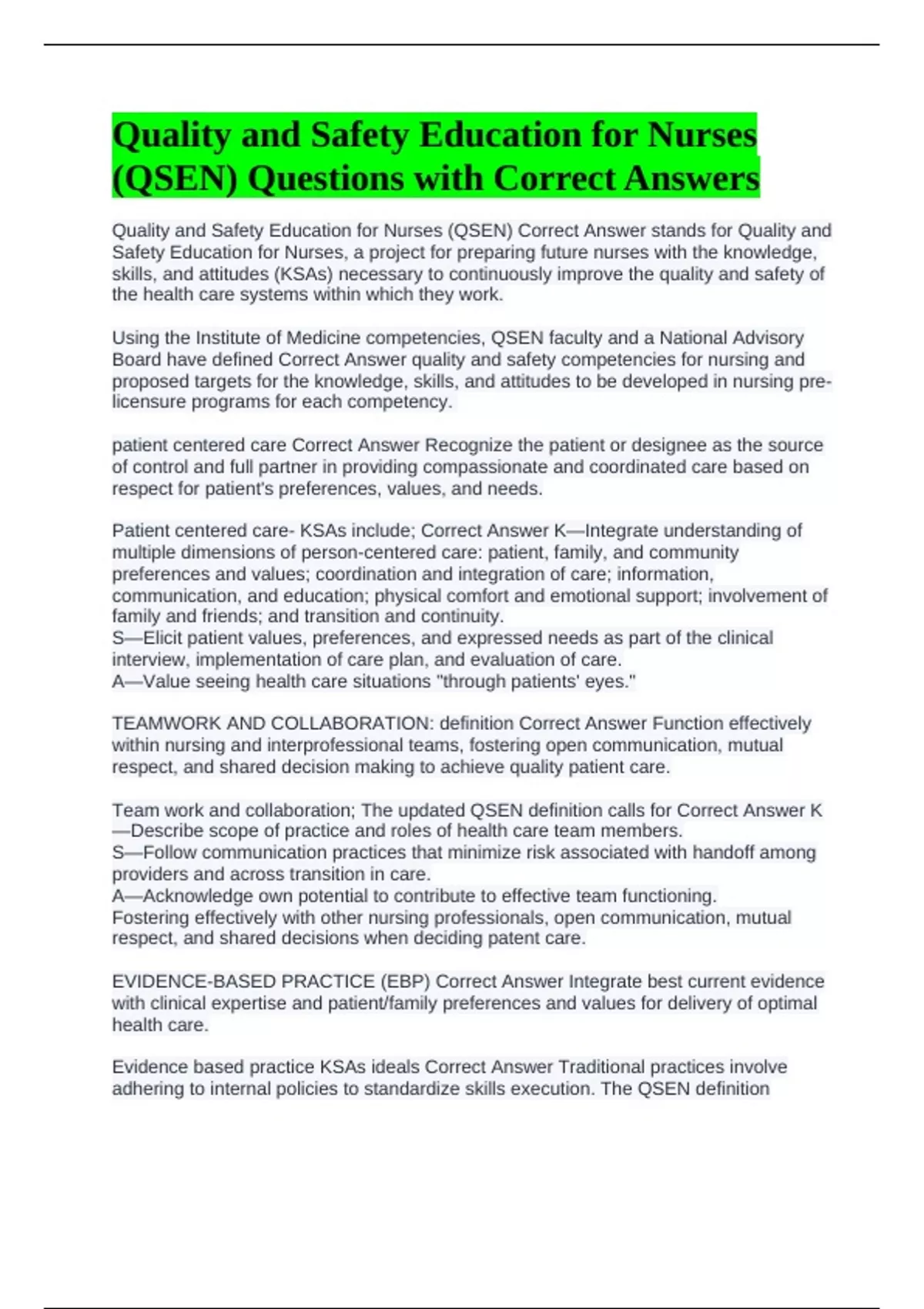 Quality and Safety Education for Nurses (QSEN) Correct Answer stands for Quality and Safety Education for Nurses, a project for preparing future nurses with the knowledge, skills, and attitudes (KSAs) necessary to continuously improve the quality and safety of the health care systems within which they work. Using the Institute of Medicine competencies, QSEN faculty and a National Advisory Board have defined Correct Answer quality and safety competencies for nursing and proposed targets for the knowledge, skills, and attitudes to be developed in nursing pre-licensure programs for each competency. patient centered care Correct Answer Recognize the patient or designee as the source of control and full partner in providing compassionate and coordinated care based on respect for patient's preferences, values, and needs. Patient centered care- KSAs include; Correct Answer K—Integrate understanding of multiple dimensions of person-centered care: patient, family, and community preferences and values; coordination and integration of care; information, communication, and education; physical comfort and emotional support; involvement of family and friends; and transition and continuity. S—Elicit patient values, preferences, and expressed needs as part of the clinical interview, implementation of care plan, and evaluation of care. A—Value seeing health care situations "through patients' eyes." TEAMWORK AND COLLABORATION: definition Correct Answer Function effectively within nursing and interprofessional teams, fostering open communication, mutual respect, and shared decision making to achieve quality patient care. Team work and collaboration; The updated QSEN definition calls for Correct Answer K—Describe scope of practice and roles of health care team members. S—Follow communication practices that minimize risk associated with handoff among providers and across transition in care. A—Acknowledge own potential to contribute to effective team functioning. Fostering effectively with other nursing professionals, open communication, mutual respect, and shared decisions when deciding patent care. EVIDENCE-BASED PRACTICE (EBP) Correct Answer Integrate best current evidence with clinical expertise and patient/family preferences and values for delivery of optimal health care. Evidence based practice KSAs ideals Correct Answer Traditional practices involve adhering to internal policies to standardize skills execution. The QSEN definition