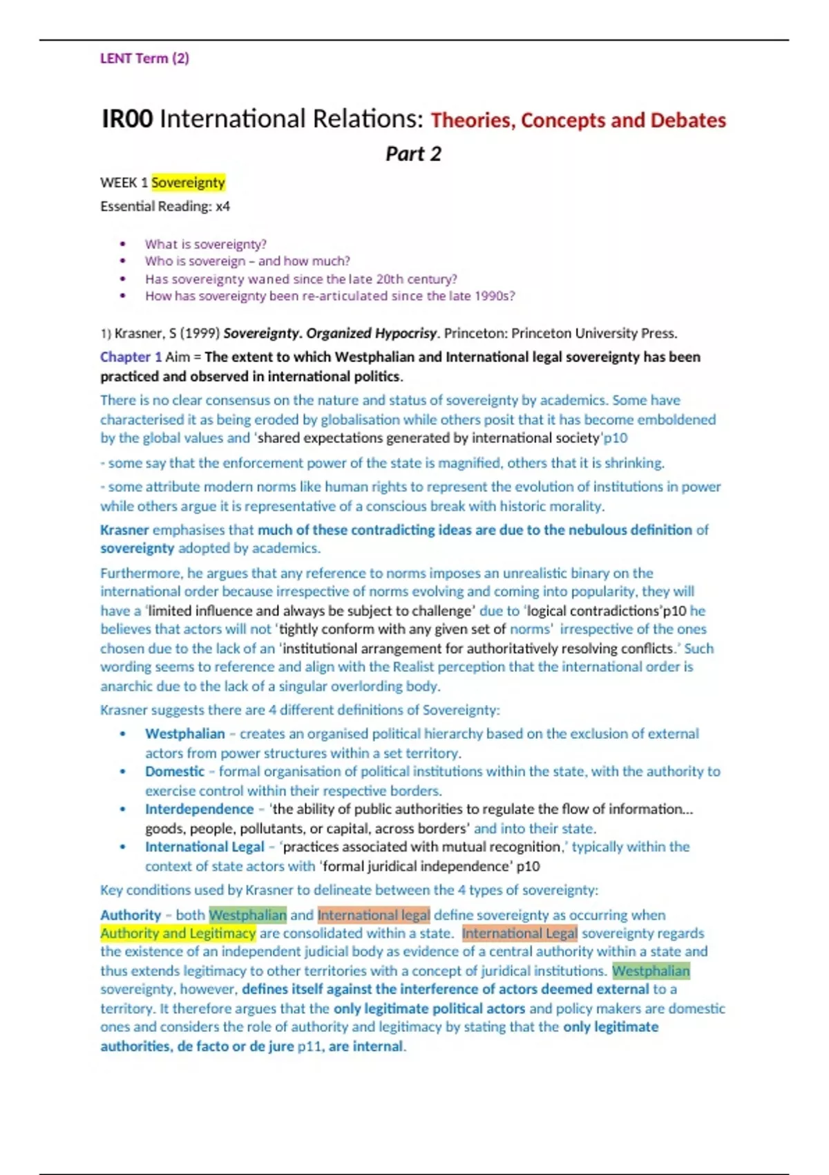 Note – Krasner’s chapters centre around Westphalian and International legal