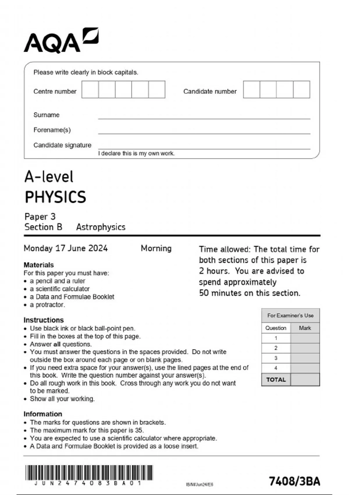 AQA A-level PHYSICS Paper 3 Section B Astrophysics 7408/3BA QP Physics A 17Jun24