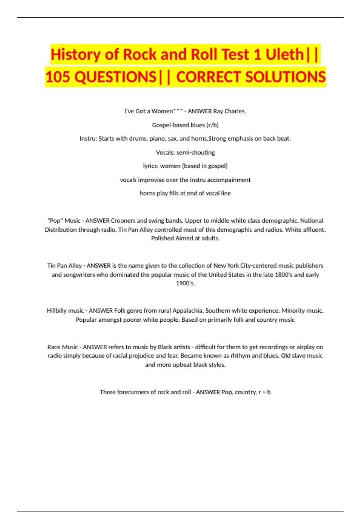 History of Rock and Roll Test 1 Uleth|| 105 QUESTIONS|| CORRECT SOLUTIONS
