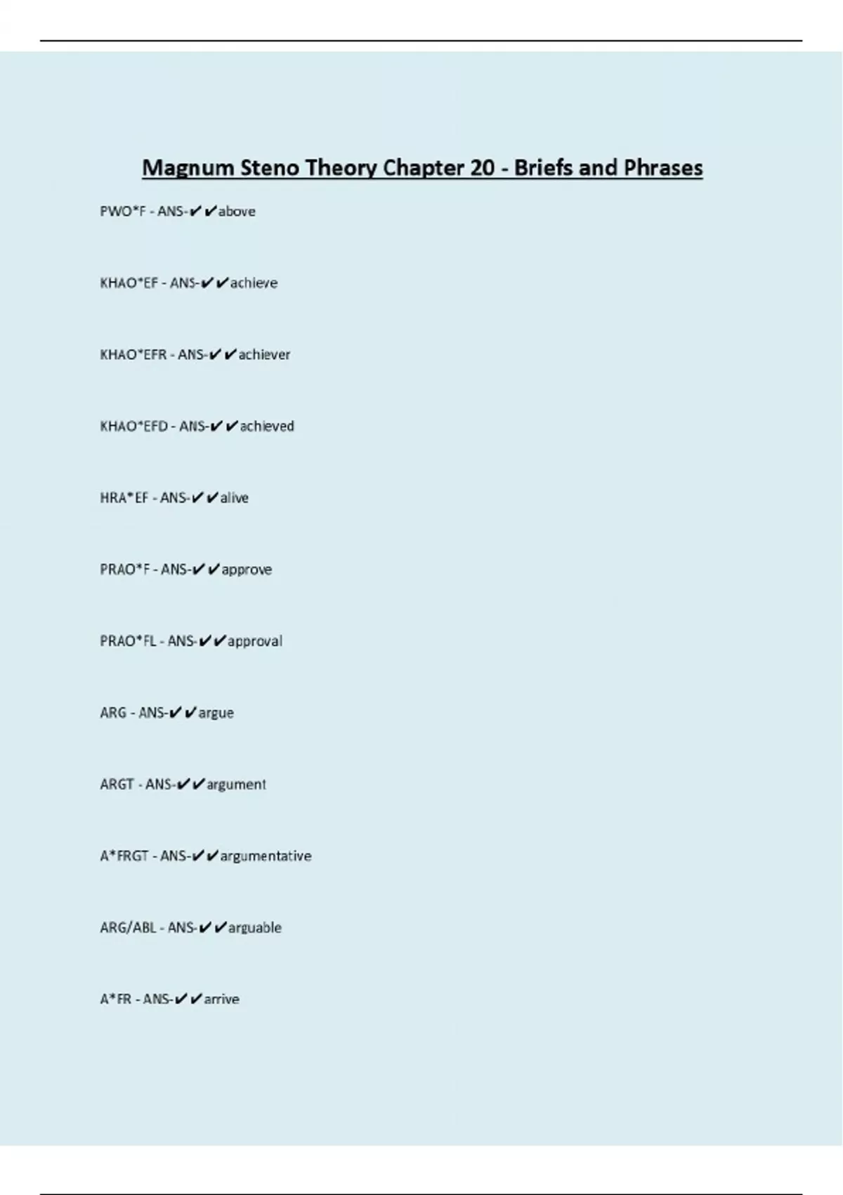 Magnum Steno Theory Chapter 20 - Briefs and Phrases PWO*F - ANS-above KHAO*EF - ANS-achieve KHAO*EFR - ANS-achiever KHAO*EFD - ANS-achieved HRA*EF - ANS-alive PRAO*F - ANS-approve PRAO*FL - ANS-approval ARG - ANS-argue ARGT - ANS-argument A*FRGT - ANS-argumentative ARG/ABL - ANS-arguable A*FR - ANS-arrive A*FRG - ANS-arriving A*FRL - ANS-arrival THO*FRT - ANS-authoritative TKHR*EUFR - ANS-deliver TKHRA*EFR - ANS-delivery TKAO*EFT - ANS-deviate TKAO*EFGT - ANS-deviating TKAO*EFS - ANS-devious A*EFLT - ANS-elevate TPH*FL - ANS-envelope *FR - ANS-ever *EFR - ANS-every *EFRB - ANS-
