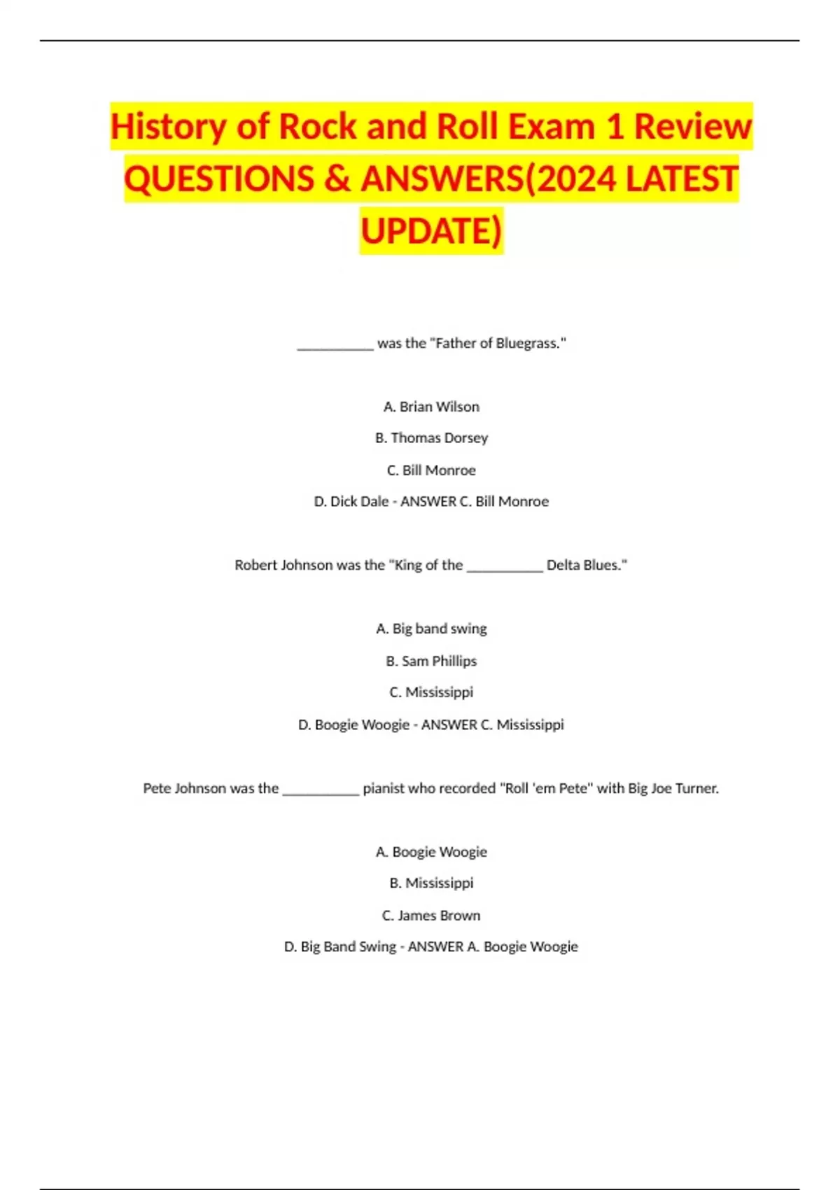 History of Rock and Roll Exam 1 Review QUESTIONS & ANSWERS(2024 LATEST UPDATE)
