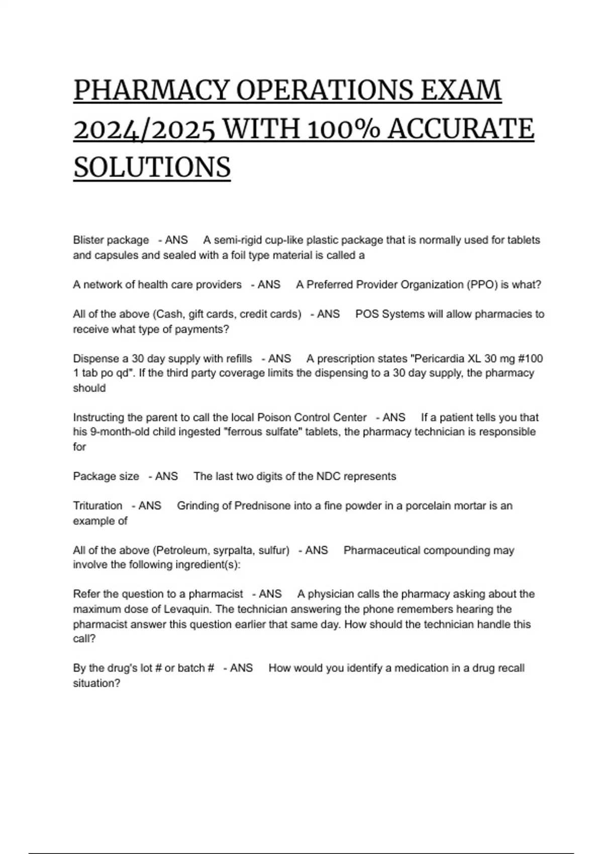 Blister package - ANS A semi-rigid cup-like plastic package that is normally used for tablets and capsules and sealed with a foil type material is called a A network of health care providers - ANS A Preferred Provider Organization (PPO) is what? All of the above (Cash, gift cards, credit cards) - ANS POS Systems will allow pharmacies to receive what type of payments? Dispense a 30 day supply with refills - ANS A prescription states "Pericardia XL 30 mg #100 1 tab po qd". If the third party coverage limits the dispensing to a 30 day supply, the pharmacy should Instructing the parent to call the local Poison Control Center - ANS If a patient tells you that his 9-month-old child ingested "ferrous sulfate" tablets, the pharmacy technician is responsible for Package size - ANS The last two digits of the NDC represents Trituration - ANS Grinding of Prednisone into a fine powder in a porcelain mortar is an example of All of the above (Petroleum, syrpalta, sulfur) - ANS Pharmaceutical compounding may involve the following ingredient(s): Refer the question to a pharmacist - ANS A physician calls the pharmacy asking about the maximum dose of Levaquin. The technician answering the phone remembers hearing the pharmacist answer this question earlier that same day. How should the technician handle this call? By the drug's lot # or batch # - ANS How would you identify a medication in a drug recall situation? The weight goes on the right pan and the powder goes on the left pan - ANS When using a Class A Torsion balance to weigh Acetaminophen powder: Separate by lot number and follow operation procedures for return to manufacturer - ANS If the FDA or pharmaceutical manufacturer recalls a product, the technician should immediately Provides information concerning hazardous substances - ANS The Material Safety Data Sheets (MSDS) serve what function? 11/30/2023 When the expiration date has month/year, the drug will expire on the last day of the month of that year. - ANS If the manufacturer's expiration date for a drug is 11/23, the drug is considered okay to dispense until which date: White blood cell count (WBC) and Absolute Neutrophil Count (ANC) - ANS Lab requirements before starting Clozaril include: Information regarding product ingredients - ANS What information may a pharmacy technician get from a MSDS? Drug Refill I - ANS Of the following Drug Refills, which one is the most important in that all parties involved in the dispensing of a prescription (Doctor, Pharmacy and patient) must be notified due to the drug's potential for serious harm? 10 ml cylindrical graduate Most accurate measurement by reading the meniscus of the liquid - ANS What type of measuring device should be used for measure 5 ml of a liquid for compounding? 2 to 8 degrees Celsius or 46 to 59 degrees Fahrenheit - ANS Refrigeration is defined as a temperature range between Class I - ANS If a manufacturer's labeling results in a strong likelihood the product will cause serious adverse effects, what type FDA recall would be instituted? All of the above (Establishing and maintaining a drug formulary system, recommending policies regarding investigational drugs, collecting data from drug utilization review) - ANS The purpose of the Pharmacy & Therapeutics (P & T) Committee is to Co-pay amount - ANS Computer systems with POS software help the pharmacy to determine the patient's 10 ml cylindrical graduate - ANS What type of measuring device should be used to measure 3 ml of a liquid for compounding? All of the above (Prescription drop-off, order entry, filling and dispensing) - ANS Where do medication errors occur? Refer the patient to the pharmacist on any reports of side effects from a patient - ANS If a patient reports experiencing nasal congestion when taking a prescribed medication, the pharmacy technician should All of the above (The prescription number, directions on how to take the medication, the prescribing physician's name) - ANS Which of the following is required on a prescription label? Universal Precautions - ANS The pharmacy technician should use what kind of precautions to protect themselves and others from infection? Inform the pharmacist that the mother would like help choosing a nonprescription product. - ANS While a mother is waiting for an Amoxicillin prescription for her 8 year old, she asks the technician what to give the child for fever. The technician should United States Pharmacopoeia (USP) - ANS This reference book contains official drug standards and is a required reference source in all licensed pharmacy settings. 24 hours - ANS Most unit-dose systems provide each patient with a storage bin, which can be found a supply of drugs for Desiccation - ANS The process which utilizes dehydration to remove moisture from a solid substance is called Cylindrical graduate (because the meniscus is used for measurement) - ANS Which of the following is the most accurate device for measuring 30 ml of Diphenhydramine? Provide the patient with the "For the Patient" instructions or Patient Package Insert (PPI) included with the inhaler. - ANS You receive the following prescription: Vancenase (Beclomethasone) Inhaler Dispense #1 Sig: ii puffs inhaled bid. In filling the prescription, the technician should The cost of the medication - ANS When developing a policy and procedure for ensuring the safety of a medication in a multi-dose vial, all the following should be considered except All of the above (Personnel orientation, training, and evaluation; correct aseptic (sterile) technique; position or job description) - ANS A Policy and Procedure Manual may provide guidance each of the following areas Modem - ANS The device that links computers via communication lines is called the A minimum order set by the manufacturer - ANS The purchasing of drugs directly from the manufacturer usually requires Driver's license number - ANS Refills for prescriptions requested by patients via the phone should contain all but All of the above (Medical dev