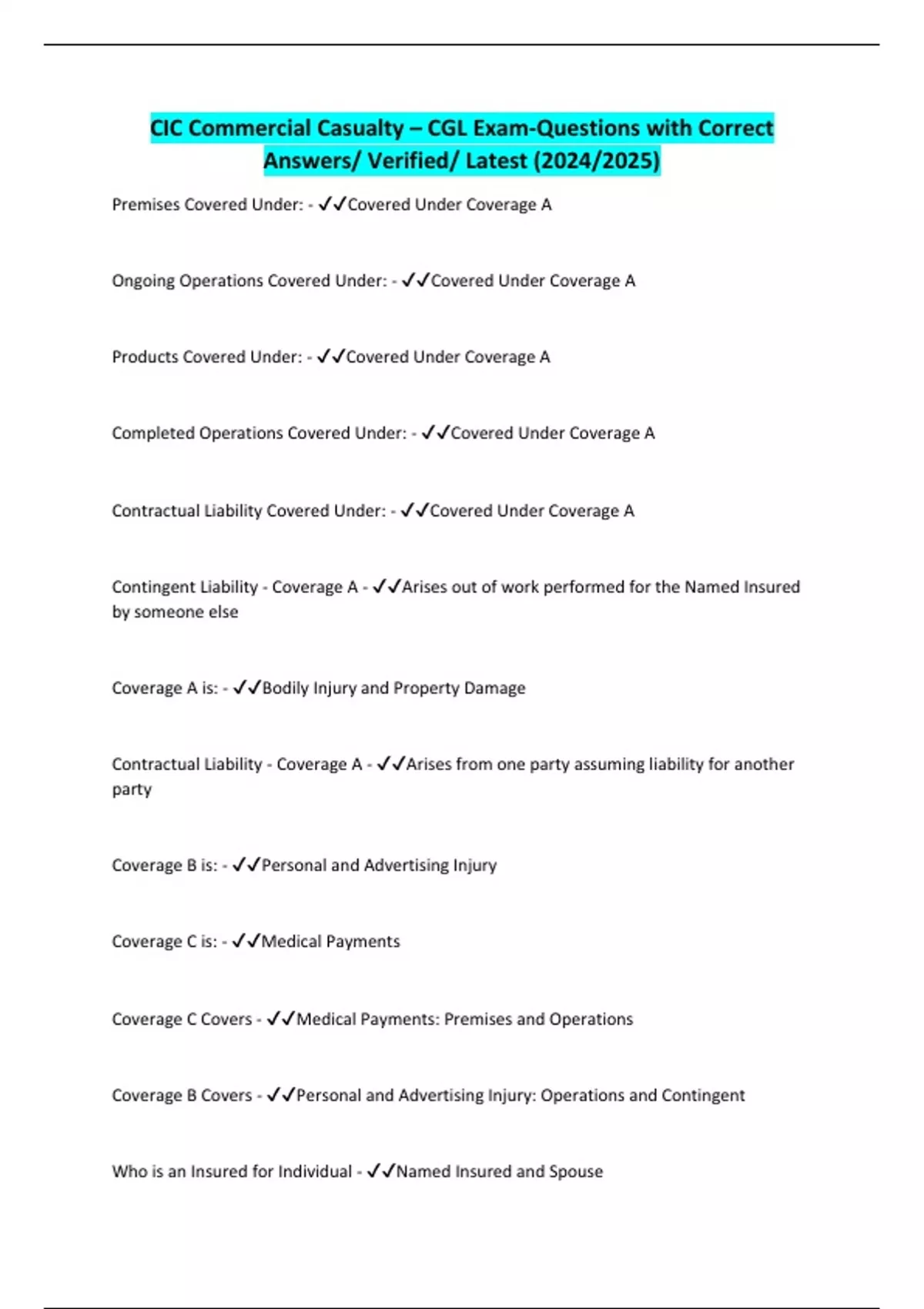 Contractual Liability Covered Under: - ✔✔Covered Under Coverage A