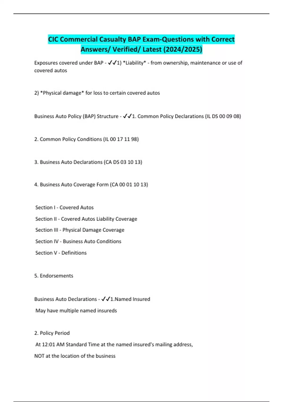 Business Auto Policy (BAP) Structure - ✔✔1. Common Policy Declarations (IL DS 00 09 08)
