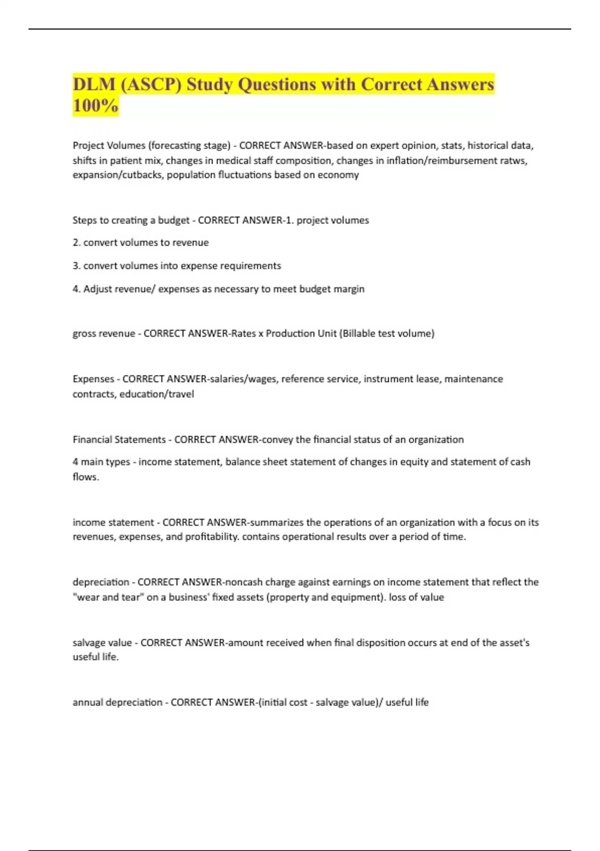 DLM (ASCP) Study Questions with Correct Answers 100% Project Volumes (forecasting stage) - CORRECT ANSWER-based on expert opinion, stats, historical data, shifts in patient mix, changes in medical staff composition, changes in inflation/reimbursement ratws, expansion/cutbacks, population fluctuations based on economy Steps to creating a budget - CORRECT ANSWER-1. project volumes 2. convert volumes to revenue 3. convert volumes into expense requirements 4. Adjust revenue/ expenses as necessary to meet budget margin gross revenue - CORRECT ANSWER-Rates x Production Unit (Billable test volume) Expenses - CORRECT ANSWER-salaries/wages, reference service, instrument lease, maintenance contracts, education/travel Financial Statements - CORRECT ANSWER-convey the financial status of an organization 4 main types - income statement, balance sheet statement of changes in equity and statement of cash flows. income statement - CORRECT ANSWER-summarizes the operations of an organization with a focus on its revenues, expenses, and profitability. contains operational results over a period of time. depreciation - CORRECT ANSWER-noncash charge against earnings on income statement that reflect the "wear and tear" on a business' fixed assets (property and equipment). loss of value salvage value - CORRECT ANSWER-amount received when final disposition occurs at end of the asset's useful life. annual depreciation - CORRECT ANSWER-(initial cost - salvage value)/ useful life Profit - CORRECT ANSWER-net income -expense cashflow - CORRECT ANSWER-net income + depreciation Total Profit Margin - CORRECT ANSWER-Net income divided by total revenues. It measures the amount of total profit per dollar of total revenues. fixed costs - CORRECT ANSWER-cost not related to the volume of services delivered (ex. facilities cost, lab admin, instrument leases, maintenance contracts) variable cost - CORRECT ANSWER-directly related to the volume of services delivered (ex. supplies, labor costs) Profit Analysis - CORRECT ANSWER-technique use to analyze the effects of volume changes on profit. can also be used to analyze effects of volume changes on costs. Total Costs - CORRECT ANSWER-fixed costs + variable costs Variable costs = variable cost rate x volume contribution margin - CORRECT ANSWER-difference between per unit revenue and per unit variable cost. gives the amount left to cover the fixed costs. after fixed costs are covered what's left contributes to the profit. accounting breakeven - CORRECT ANSWER-Volume needed to produce zero profit. Revenues cover all accounting costs. Total Revenue (cost x volume) - Total Variable (variable cost rate x volume) - fixed costs = $0 economic breakeven - CORRECT ANSWER-occurs when all accounting costs plus a profit target are covered total revenue - total variable cost- fixed cost = profit Surcharge/Cost Plus - CORRECT ANSWER-used for reference/send out testing. Determine cost of doing a procedure then add markup factor to get appropriate price. weight value basis - CORRECT ANSWER-each test performed is assigned a weight based on cost of performing the test in relation to the procedure.