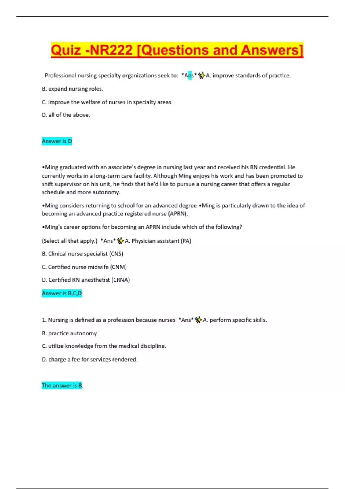 1. Nursing is defined as a profession because nurses *Ans* A. perform specific skills.