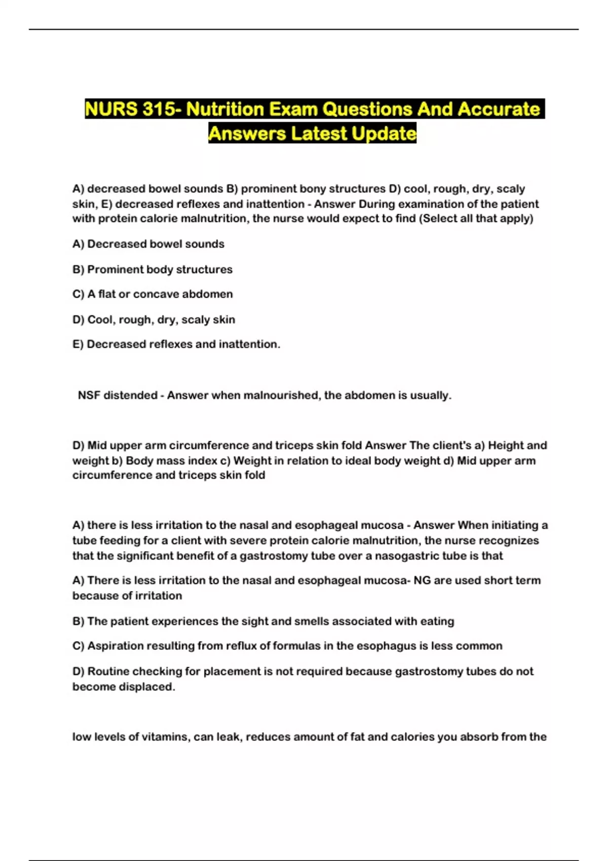 NURS 315- Nutrition Exam Questions And Accurate