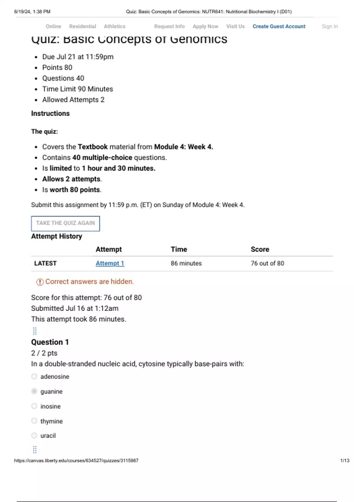 Quiz: Basic Concepts of Genomics: NUTR641: Nutritional Biochemistry I (D01) Score for this attempt: 76 out of 80 Summer 2024/2025.