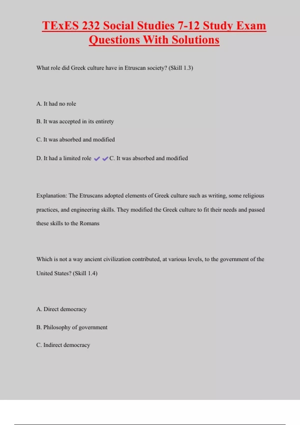 Explanation: The Etruscans adopted elements of Greek culture such as writing, some religious