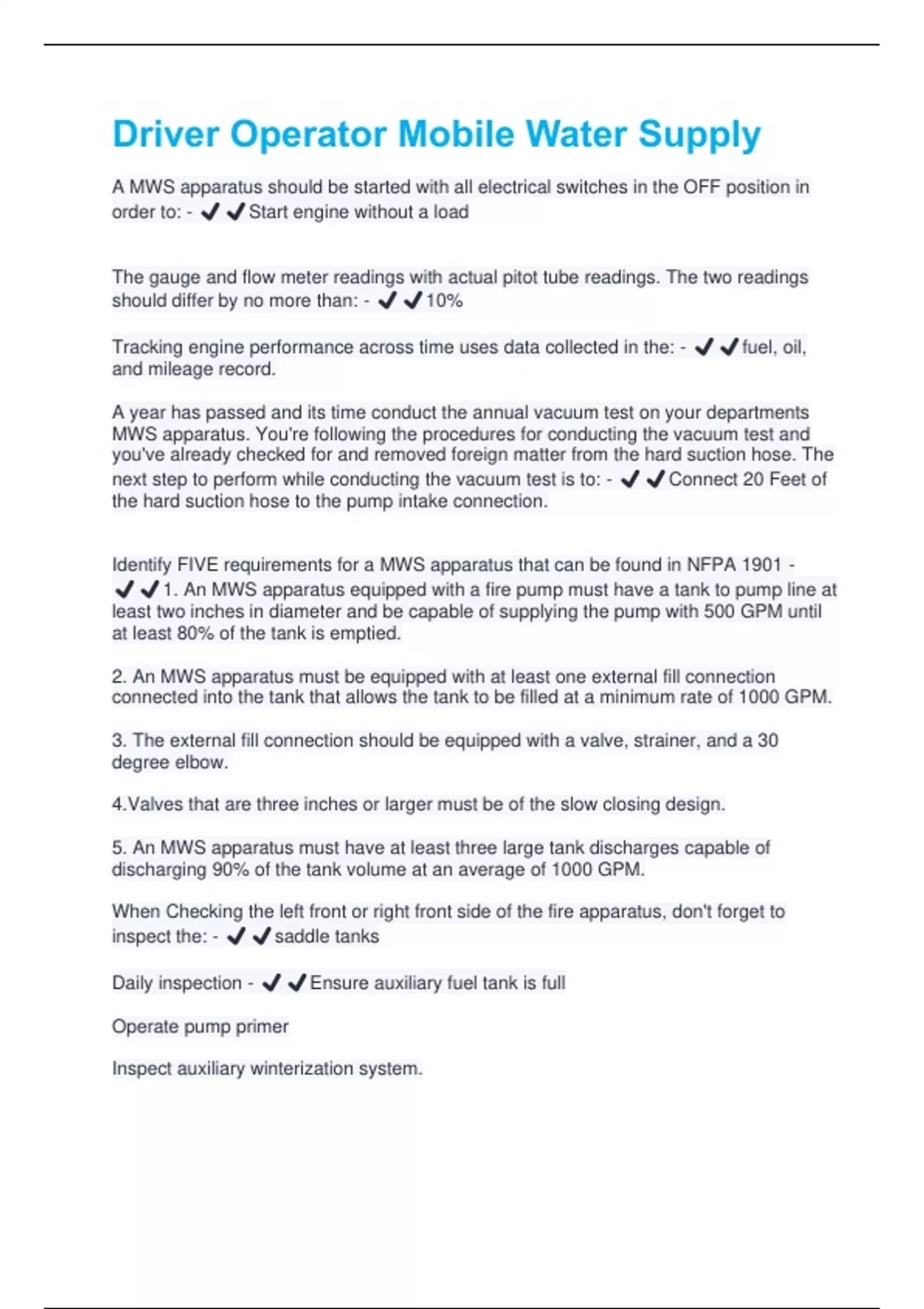 A MWS apparatus should be started with all electrical switches in the OFF position in order to: - ️️Start engine without a load The gauge and flow meter readings with actual pitot tube readings. The two readings should differ by no more than: - ️️10% Tracking engine performance across time uses data collected in the: - ️️fuel, oil, and mileage record. A year has passed and its time conduct the annual vacuum test on your departments MWS apparatus. You're following the procedures for conducting the vacuum test and you've already checked for and removed foreign matter from the hard suction hose. The next step to perform while conducting the vacuum test is to: - ️️Connect 20 Feet of the hard suction hose to the pump intake connection. Identify FIVE requirements for a MWS apparatus that can be found in NFPA 1901 - ️️1. An MWS apparatus equipped with a fire pump must have a tank to pump line at least two inches in diameter and be capable of supplying the pump with 500 GPM until at least 80% of the tank is emptied. 2. An MWS apparatus must be equipped with at least one external fill connection connected into the tank that allows the tank to be filled at a minimum rate of 1000 GPM. 3. The external fill connection should be equipped with a valve, strainer, and a 30 degree elbow. 4.Valves that are three inches or larger must be of the slow closing design. 5. An MWS apparatus must have at least three large tank discharges capable of discharging 90% of the tank volume at an average of 1000 GPM. When Checking the left front or right front side of the fire apparatus, don't forget to inspect the: - ️️saddle tanks Daily inspection - ️️Ensure auxiliary fuel tank is full Operate pump primer Inspect auxiliary winterization system.Weekly Inspection - ️️Clean intake strainers Pre-service pump certification test are conducted by: - ️️An independent testing agency When using a static body of water as your water source during fire apparatus service testing, the water surface must not be more than___ feet above the centerline of the pump intake and the water must be at least _____ feet deep. - ️️10 Feet above 4 Feet deep If the engine speed check proves the MWS apparatus is running at a different speed than what which it was originally rated, you need to? - ️️Stop the testing until the problem is corrected. When conducting a priming device test and using a pump of less than 1500 GPM, the priming device should be able to create the necessary vacuum in ____ seconds to lift water 10 feet through 20 feet of hard suction hose. - ️️30 seconds