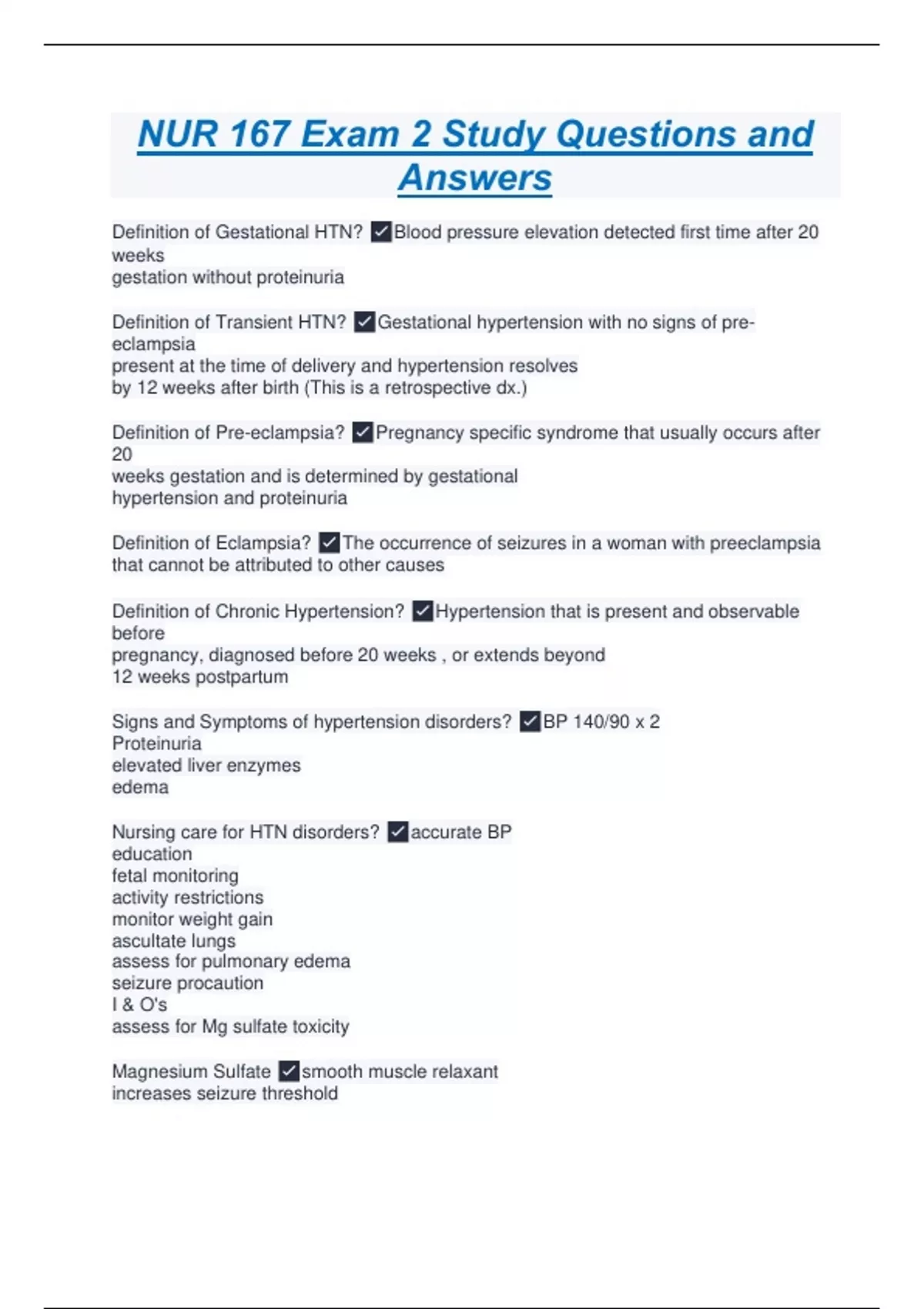 Definition of Gestational HTN? Blood pressure elevation detected first time after 20 weeks gestation without proteinuria Definition of Transient HTN? Gestational hypertension with no signs of pre-eclampsia present at the time of delivery and hypertension resolves by 12 weeks after birth (This is a retrospective dx.) Definition of Pre-eclampsia? Pregnancy specific syndrome that usually occurs after 20 weeks gestation and is determined by gestational hypertension and proteinuria Definition of Eclampsia? The occurrence of seizures in a woman with preeclampsia that cannot be attributed to other causes Definition of Chronic Hypertension? Hypertension that is present and observable before pregnancy, diagnosed before 20 weeks , or extends beyond 12 weeks postpartum Signs and Symptoms of hypertension disorders? BP 140/90 x 2 Proteinuria elevated liver enzymes edema Nursing care for HTN disorders? accurate BP education fetal monitoring activity restrictions monitor weight gain ascultate lungs assess for pulmonary edema seizure procaution I & O's assess for Mg sulfate toxicity Magnesium Sulfate smooth muscle relaxant increases seizure threshold