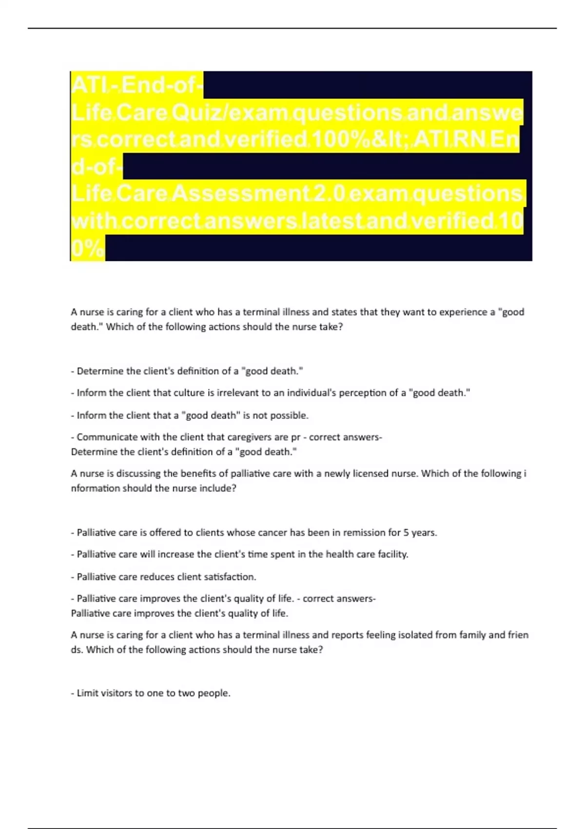Life Care Quiz/exam questions and answe