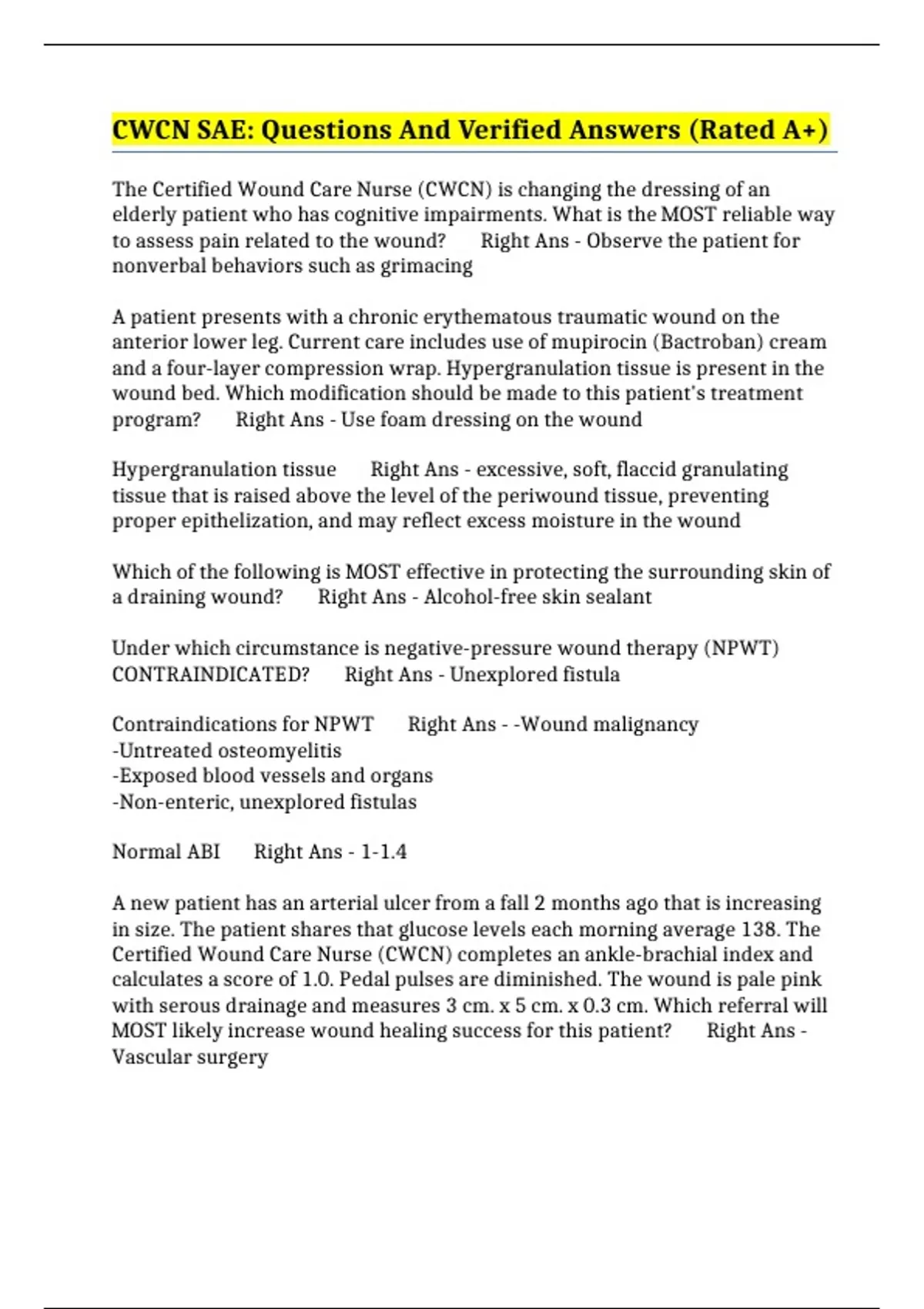calculates a score of 1.0. Pedal pulses are diminished. The wound is pale pink