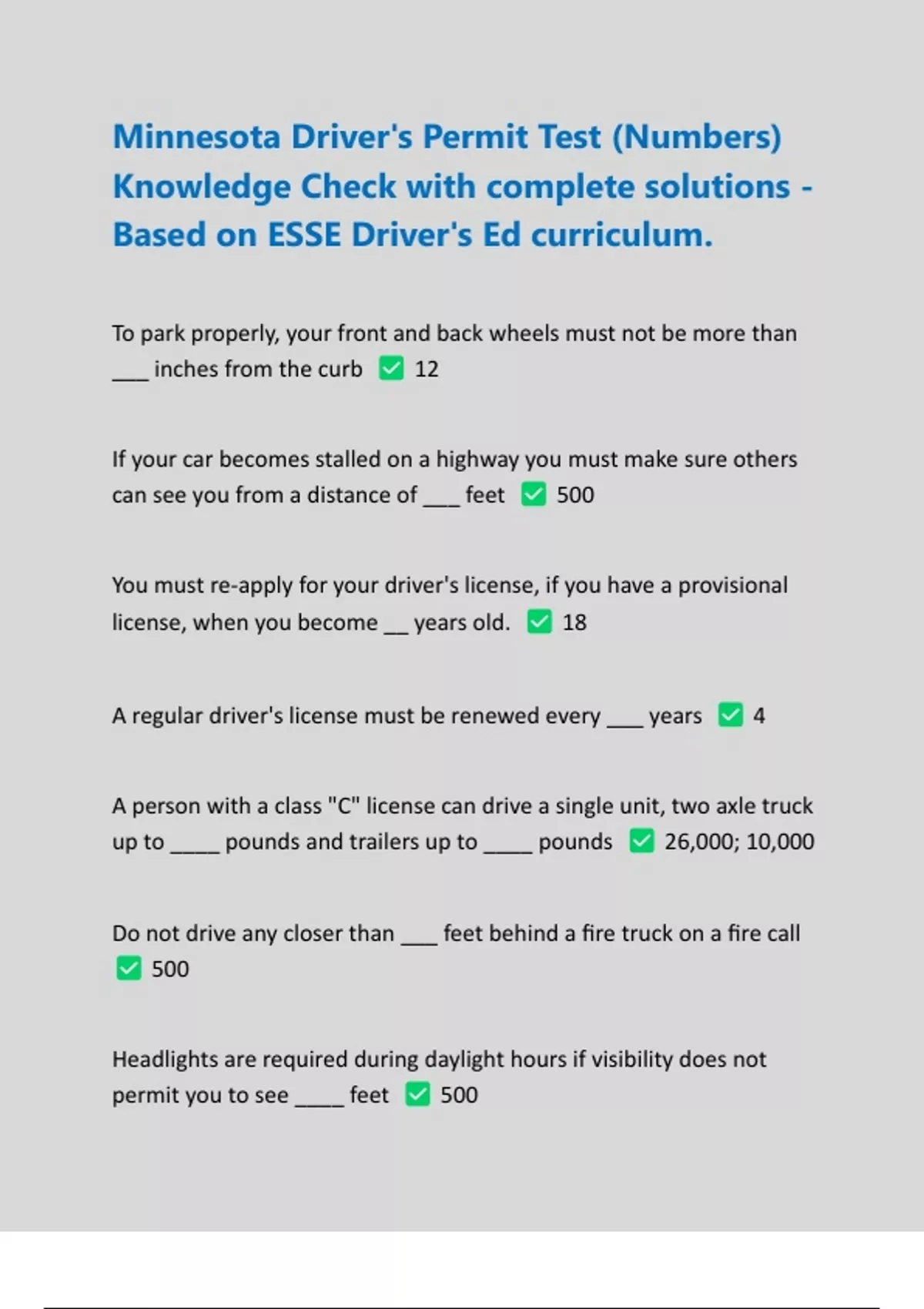 Minnesota Driver's Permit Test (Numbers) Knowledge Check with complete solutions - Based on ESSE Driver's Ed curriculum |Updated 2024/2025