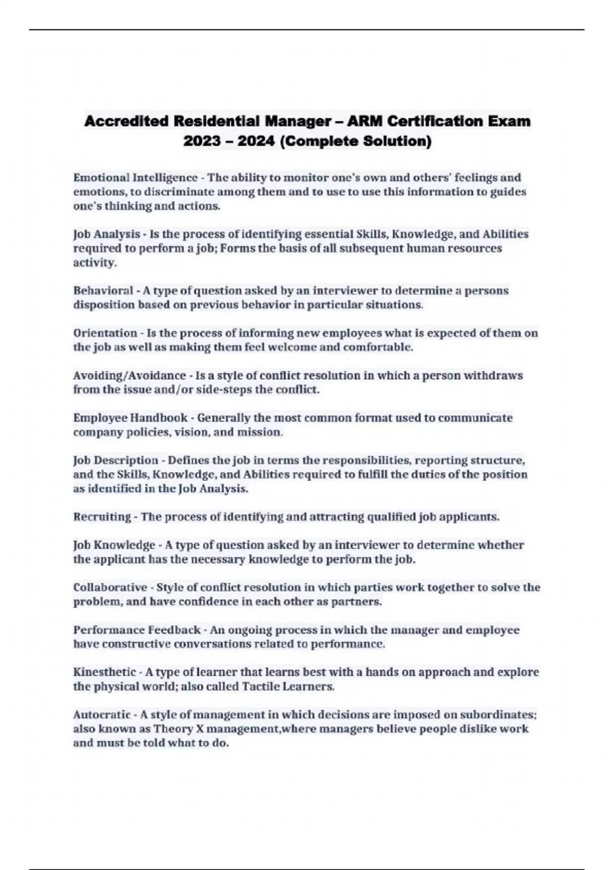 Emotional Intelligence - The ability to monitor one's own and others' feelings and emotions, to discriminate among them and to use to use this information to guides one's thinking and actions. Job Analysis - Is the process of identifying essential Skills, Knowledge, and Abilities required to perform a job; Forms the basis of all subsequent human resources activity. Behavioral - A type of question asked by an interviewer to determine a persons disposition based on previous behavior in particular situations. Orientation - Is the process of informing new employees what is expected ofthem on the job as well as making them feel welcome and comfortable. Avoiding/Avoidance - Is a style of conflict resolution in which a person withdraws from the issue and/or side-steps the conflict. Employee Handbook - Generally the most common format used to communicate company policies, vision, and mission. Job Description - Defines the job in terms the responsibilities, reporting structure, and the Skills, Knowledge, and Abilities required to fulfill the duties of the position as identified in the Job Analysis. Recruiting - The process of identifying and attracting qualified job applicants. Job Knowledge - A type of question asked by an interviewer to determine whether the applicant has the necessary knowledge to perform the job. Collaborative - Style of conflict resolution in which parties work together to solve the problem, and have confidence in each other as partners. Performance Feedback - An ongoing process in which the manager and employee have constructive conversations related to performance. Kinesthetic - A type of learner that learns best with a hands on approach and explore the physical world; also called Tactile Learners. Autocratic - A style of management in which decisions are imposed on subordinates; also known as Theory X management,where managers believe people dislike work and must be told what to do. Coaching - Is used to develop employees rather than address specific behaviors and performance. Equal Employment Opportunity Commission - EEOC Rent Roll/Collections R