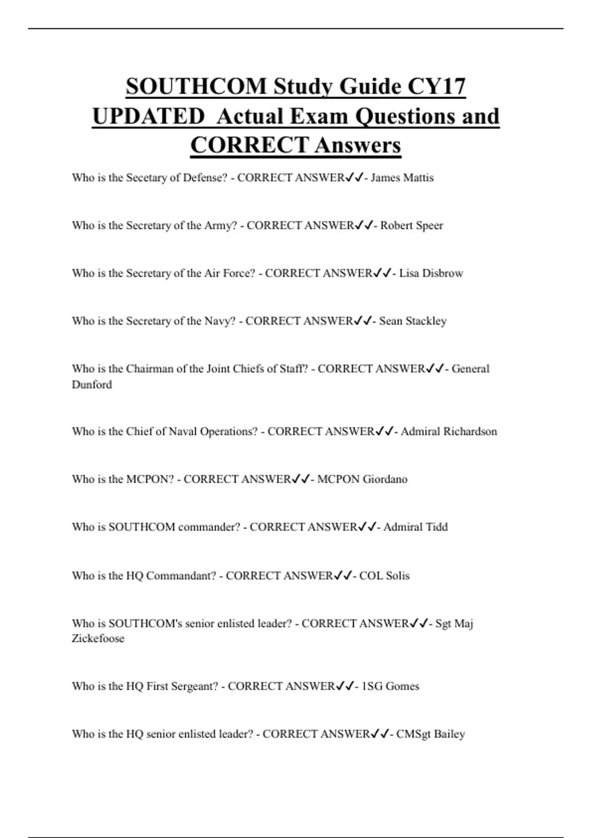 Who is SOUTHCOM's senior enlisted leader? - CORRECT ANSWER✔✔- Sgt Maj