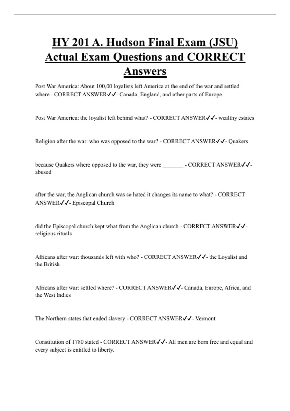 HY 201 A. Hudson Final Exam (JSU) Actual Exam Questions and CORRECT Answers Post War America: About 100,00 loyalists left America at the end of the war and settled where - CORRECT ANSWER- Canada, England, and other parts of Europe Post War America: the loyalist left behind what? - CORRECT ANSWER- wealthy estates Religion after the war: who was opposed to the war? - CORRECT ANSWER- Quakers