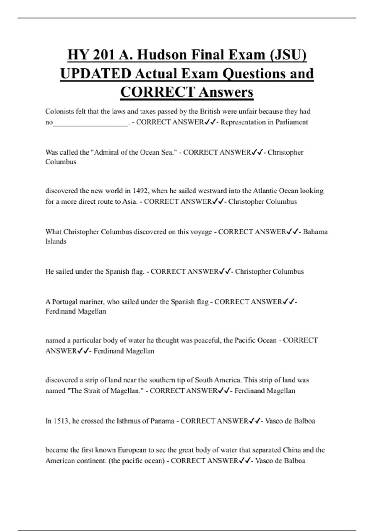 HY 201 A. Hudson Final Exam (JSU) UPDATED Actual Exam Questions and CORRECT Answers Colonists felt that the laws and taxes passed by the British were unfair because they had no____________________. - CORRECT ANSWER- Representation in Parliament Was called the "Admiral of the Ocean Sea." - CORRECT ANSWER- Christopher Columbus