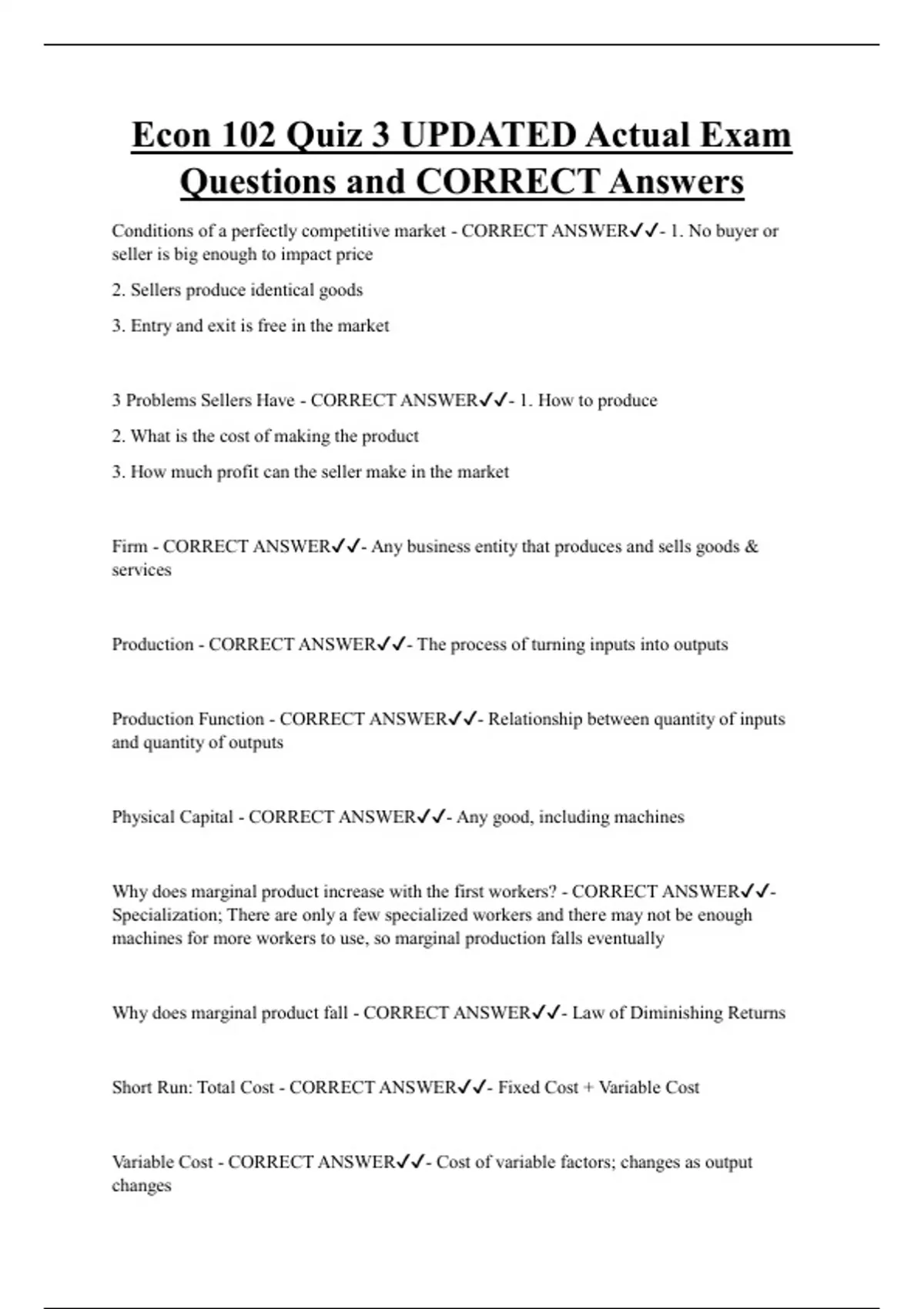 Econ 102 Quiz 3 UPDATED Actual Exam Questions and CORRECT Answers Conditions of a perfectly competitive market - CORRECT ANSWER- 1. No buyer or seller is big enough to impact price 2. Sellers produce identical goods 3. Entry and exit is free in the market 3 Problems Sellers Have - CORRECT ANSWER- 1. How to produce 2. What is the cost of making the product 3. How much profit can the seller make in the marke