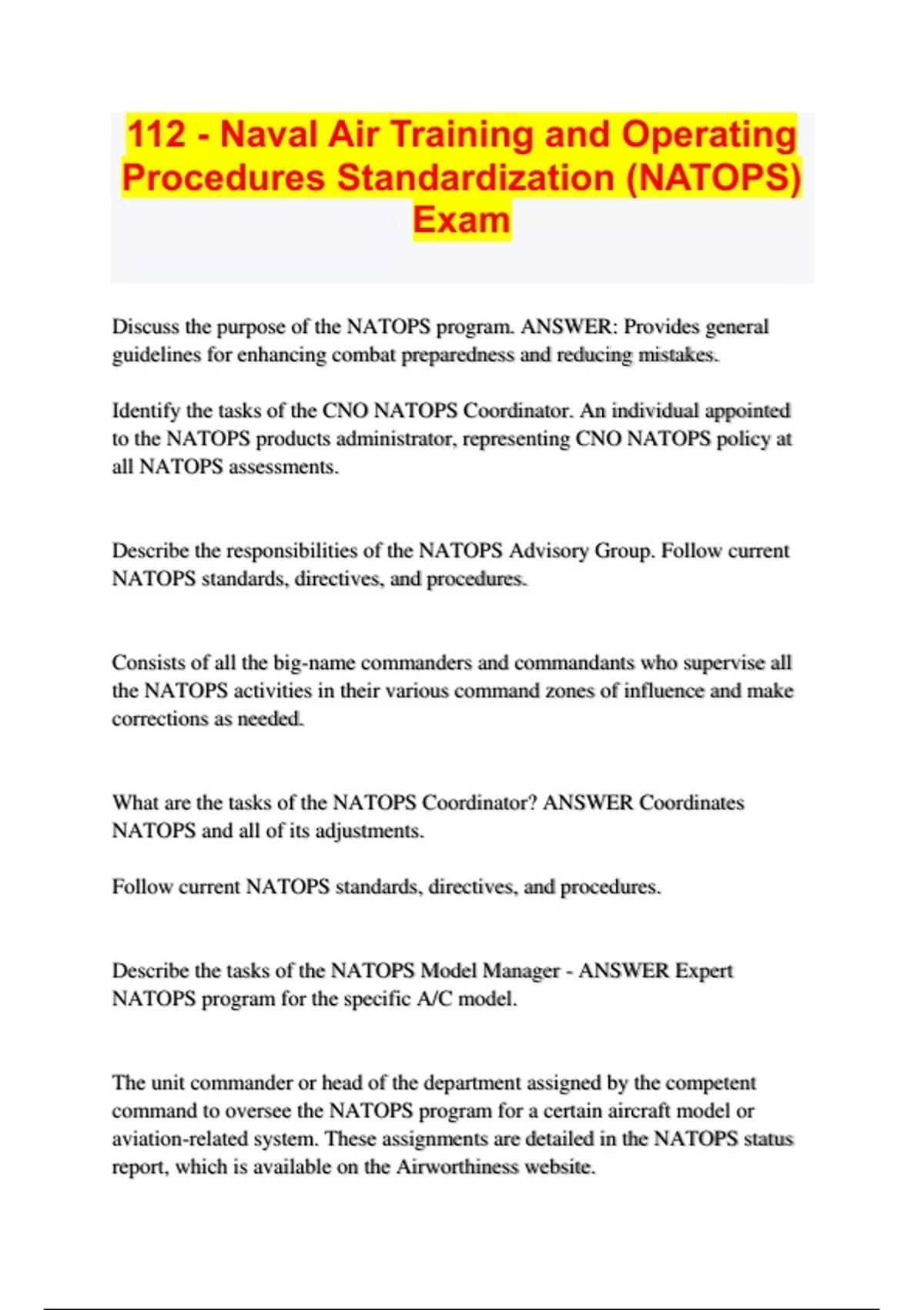 Discuss the purpose of the NATOPS program. ANSWER: Provides general