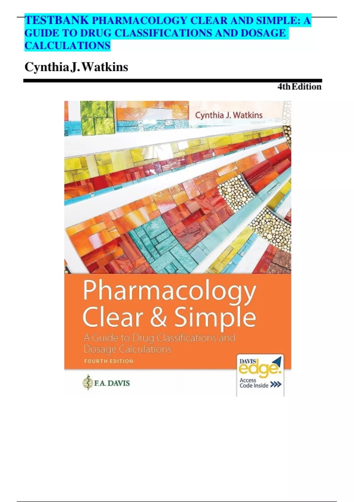 TEST BANK For Pharmacology Clear and Simple: A Guide to Drug Classifications and Dosage Calculations, 4th Edition by Cynthia J. Watkins, All Chapters 1 - 21, Verified Newest Version
