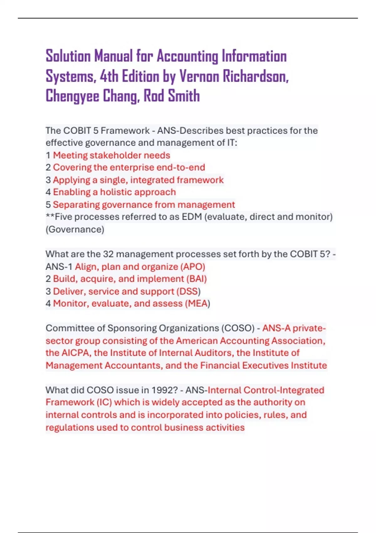 Solution Manual for Accounting Information Systems, 4th Edition by Vernon Richardson, Chengyee Chang, Rod Smith The COBIT 5 Framework - ANS-Describes best practices for the effective governance and management of IT: 1 Meeting stakeholder needs 2 Covering the enterprise end-to-end 3 Applying a single, integrated framework 4 Enabling a holistic approach 5 Separating governance from management **Five processes referred to as EDM (evaluate, direct and monitor) (Governance) What are the 32 management processes set forth by the COBIT 5? - ANS-1 Align, plan and organize (APO) 2 Build, acquire, and implement (BAI) 3 Deliver, service and support (DSS) 4 Monitor, evaluate, and assess (MEA) Committee of Sponsoring Organizations (COSO) - ANS-A privatesector group consisting of the American Accounting Association, the AICPA, the Institute of Internal Auditors, the Institute of Management Accountants, and the Financial Executives Institute What did COSO issue in 1992? - ANS-Internal Control-Integrated Framework (IC) which is widely accepted as the authority on internal controls and is incorporated into policies, rules, and regulations used to control business activities Enterprise Risk Management - Integrated Framework (ERM) - ANS-A COSO framework that improves the risk management process by expanding (adds three additional elements) COSO's Internal Control-Integrated COSO's Internal Control Model consists of... - ANS-Five components and 17 Principles What are the five components of the COSO Internal Control Model? - ANS-1 Control Environment 2 Risk Assessment 3 Control Activities 4 Information and Communication 5 Monitoring ERM is the process the board of directors and management use to set strategy, identify events that may affect the entity, assess and manage risks, and provide reasonable assurance that the company achieves its objectives and goals. What are the basic principles behind ERM? - ANS-1 Companies are formed to create value for their owners 2 Management must decide how much uncertainty it will accept as it creates value 3 Uncertainty results in risk 4 Uncertainty results in opportunity 5 The ERM framwork can manage uncertainty as well as create and preserve value Internal Environment - ANS-The company culture that is the foundation for all other ERM components as it influences how organizations establish strategies and objectives; structure business activities; and identify, assess, and respond to risk Inherent Risk - ANS-the susceptibility of a set of accounts or transactions to significant control problems in the absence of internal control Residual Risk - ANS-The risk that remains after management implements internal controls or some other response to risk Management can respond to risk in four ways: - ANS-1 Reduce 2 Accept 3 Share 4 Avoid Control Activities - ANS-Policies, procedures, and rules that provide reasonable assurance that control objectives are met and risk responses are carried out Segregation of Accounting Duties - ANS-separating the accounting functions of authorization, custody, and recording to minimize an employee's ability to commit fraud The Trust Services Framework organizes IT-related controls into five principles that jointly contribute to systems reliability: - ANS-1 Security 2 Confidentiality 3 Privacy 4 Processing Integrity 5 Availability Data - ANS-facts that are collected, recorded, stored, and processed by an information system