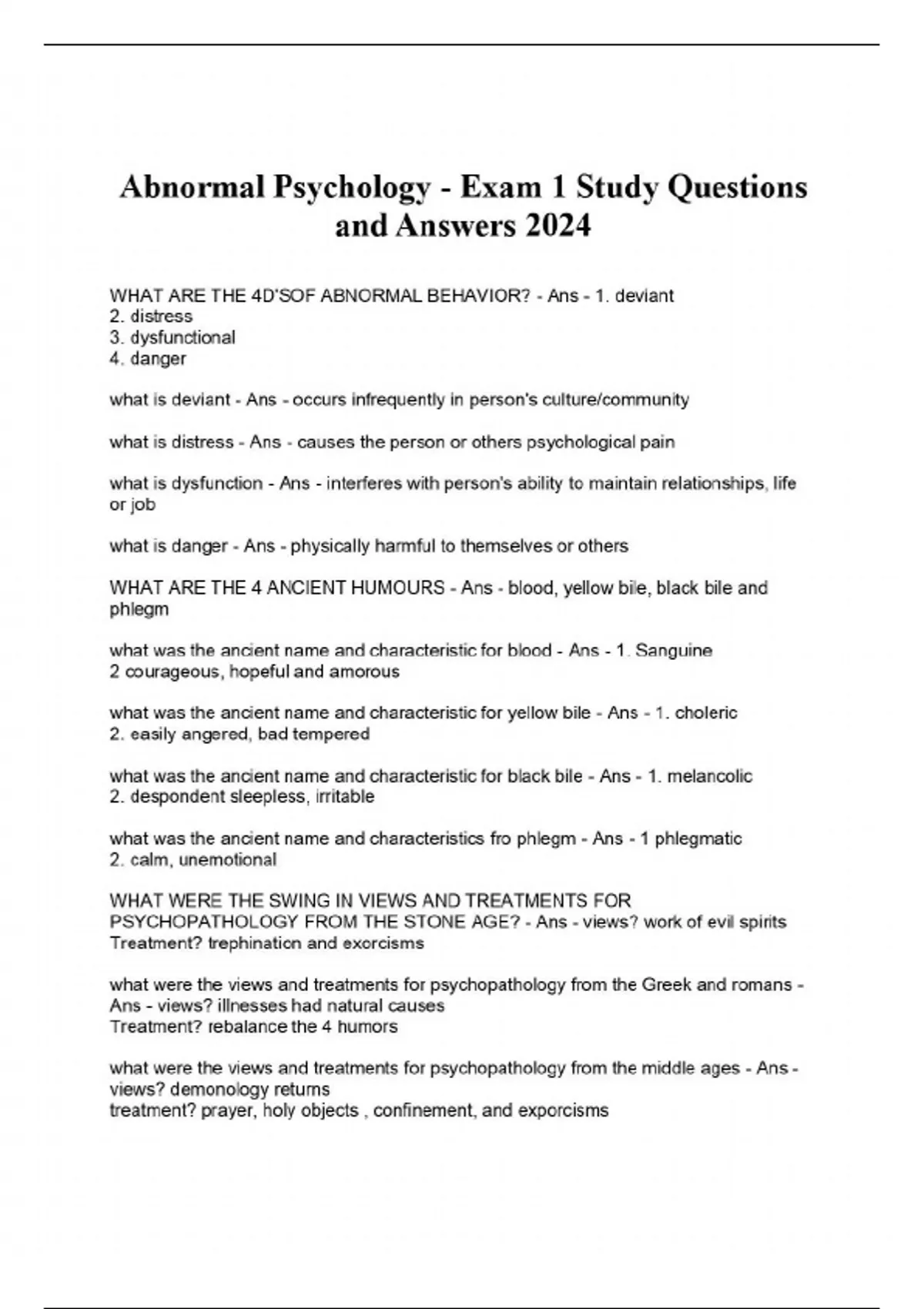 WHAT ARE THE 4D'SOF ABNORMAL BEHAVIOR? - Ans - 1. deviant 2. distress 3. dysfunctional 4. danger what is deviant - Ans - occurs infrequently in person's culture/community what is distress - Ans - causes the person or others psychological pain what is dysfunction - Ans - interferes with person's ability to maintain relationships, life or job what is danger - Ans - physically harmful to themselves or others WHAT ARE THE 4 ANCIENT HUMOURS - Ans - blood, yellow bile, black bile and phlegm what was the ancient name and characteristic for blood - Ans - 1. Sanguine 2 courageous, hopeful and amorous what was the ancient name and characteristic for yellow bile - Ans - 1. choleric 2. easily angered, bad tempered what was the ancient name and characteristic for black bile - Ans - 1. melancolic 2. despondent sleepless, irritabl