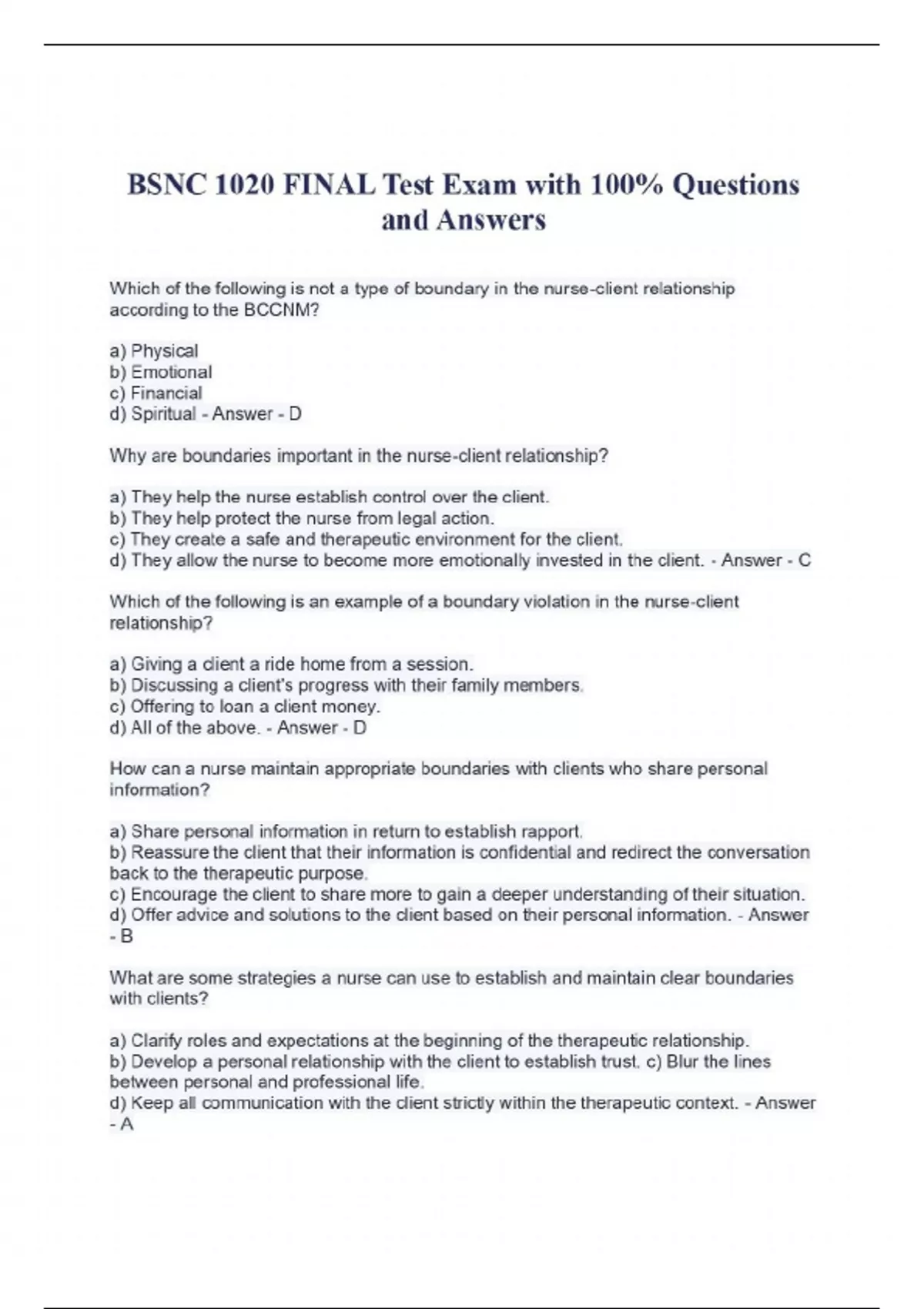 Which of the following is not a type of boundary in the nurse-client relationship according to the BCCNM? a) Physical b) Emotional c) Financial d) Spiritual - Answer - D Why are boundaries important in the nurse-client relationship? a) They help the nurse establish control over the client. b) They help protect the nurse from legal action. c) They create a safe and therapeutic environment for the client. d) They allow the nurse to become more emotionally invested in the client. - Answer - C Which of the following is an example of a boundary violation in the nurse-client relationship? a) Giving a client a ride home from a session. b) Discussing a client's progress with their family members. c) Offering to loan a client money. d) All of the above. - Answer - D How can a nurse maintain appropriate boundaries with clients who share personal information? a) Share personal information in return to establish rapport. b) Reassure the client that their information is confidential and redirect the conversation back to the therapeutic purpose. c) Encourage the client to share more to gain a deeper understanding of their situation. d) Offer advice and solutions to the client based on their personal information. - Answer - B What are some strategies a nurse can use to establish and maintain clear boundaries with clients? a) Clarify roles and expectations at the beginning of the therapeutic relationship. b) Develop a personal relationship with the client to establish trust. c) Blur the lines between personal and professional life. d) Keep all communication with the client strictly within the therapeutic context. - Answer -