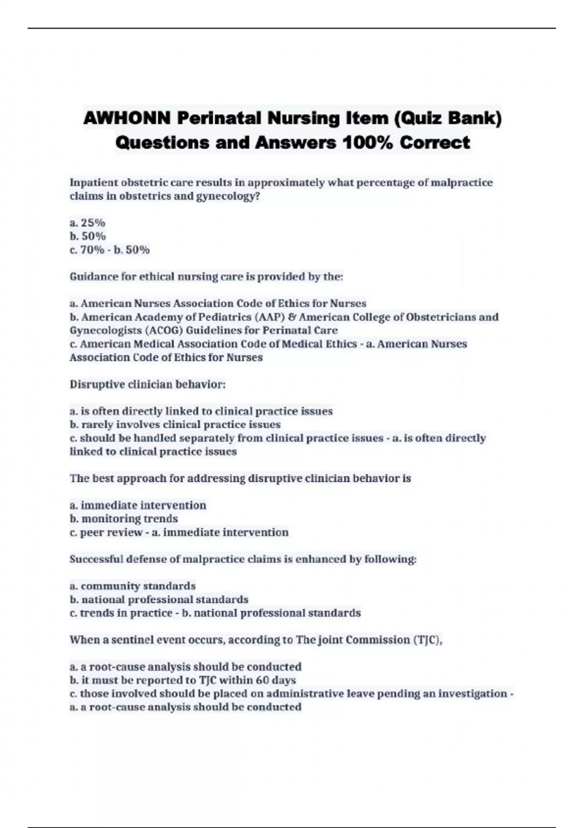 Inpatient obstetric care results in approximately what percentage of malpractice claims in obstetrics and gynecology? a. 25% b. 50% c. - b. 50% Guidance for ethical nursing care is provided by the: a. American Nurses Association Code of Ethics for Nurses b. American Academy of Pediatrics (AAP) & American College of Obstetricians and Gynecologists (ACOG) Guidelines for Perinatal Care c. American Medical Association Code of Medical Ethics - a. American Nurses Association Code of Ethics for Nurses Disruptive clinician behavior: a. is often directly linked to clinical practice issues b. rarely involves clinical practice issues c. should be handled separately from clinical practice issues - a. is often directly linked to clinical practice issues The best approach for addressing disruptive clinician behavior is a. immediate intervention b. monitoring trends c. peer review - a. immediate intervention Successful defense of malpractice claims is enhanced by following: a. community standards b. national professional standards c. trends in practice - b. national professional standards When a sentinel event occurs, according to The joint Commission (TJC), a. a root-cause analysis should be