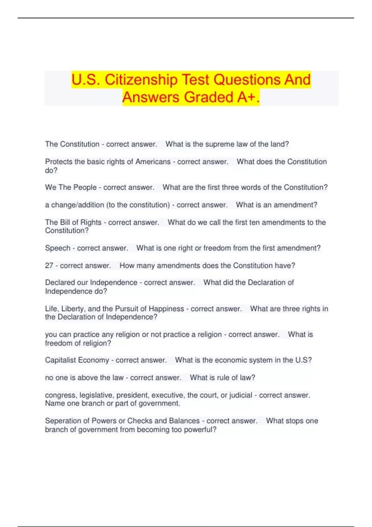 U.S. Citizenship Test Questions And Answers Graded A+. The Constitution - correct answer. What is the supreme law of the land? Protects the basic rights of Americans - correct answer. What does the Constitution do? We The People - correct answer. What are the first three words of the Constitution? a change/addition (to the constitution) - correct answer. What is an amendment? The Bill of Rights - correct answer. What do we call the first ten amendments to the Constitution? Speech - correct answer. What is one right or freedom from the first amendment? 27 - correct answer. How many amendments does the Constitution have? Declared our Independence - correct answer. What did the Declaration of Independence do? Life, Liberty, and the Pursuit of Happiness - correct answer. What are three rights in the Declaration of Independence? you can practice any religion or not practice a religion - correct answer. What is freedom of religion? Capitalist Economy - correct answer. What is the economic system in the U.S? no one is above the law - correct answer. What is rule of law? congress, legislative, president, executive, the court, or judicial - correct answer. Name one branch or part of government. Seperation of Powers or Checks and Balances - correct answer. What stops one branch of government from becoming too powerful? The President - correct answer. Who is in charge of the executive branch? Congress - correct answer. Who makes federal laws? The Senate and House of Representatives - correct answer. What are the two parts of the U.S congress? 100 - correct answer. How many U.S senators are there? 6 - correct answer. We elect a U.S. senator for how many years? Chuck Grassley or Tom Harkin - correct answer. Who is one of your states U.S senators? 435 - correct answer. The House of Representatives has how many voting members? 2 - correct answer. We elect U.S Representatives for how many years? Bruce Braley, David Loebsack, Leonard Boswell, Thomas Latham, or Steve King - correct answer. Name your U.S Representatives. All people of the state - correct answer. Who does a U.S senator represent? They have a bigger population - correct answer. Why do some states have more representatives than other states? 4 - correct answer. We elect a president for how many years? November - correct answer. What month do we vote for president? Barack Obama - correct answer. What is the President of the United States name now? Joe Biden - correct answer. What is the name of the vice president now? Vice President - correct answer. If the president can no longer serve who becomes president? Speaker of the House - correct answer. If both the president and the vice president can no longer serve then who becomes president? the President - correct answer. Who is the commander in chief of the military? the President - correct answer. Who signs bills to become the laws? the President - correct answer. Who vetoes bills?