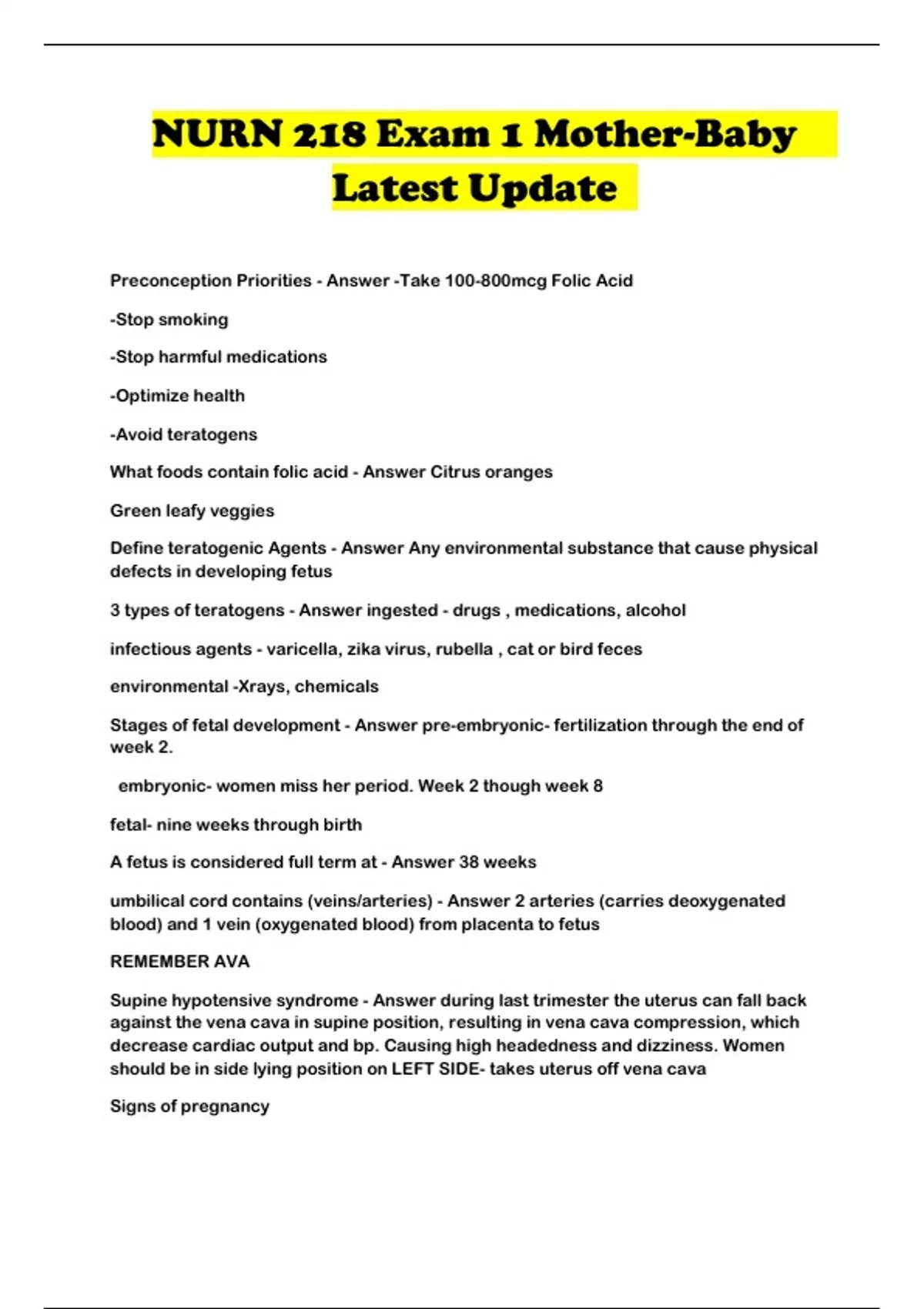 NURN 218 Exam 1 Mother-Baby