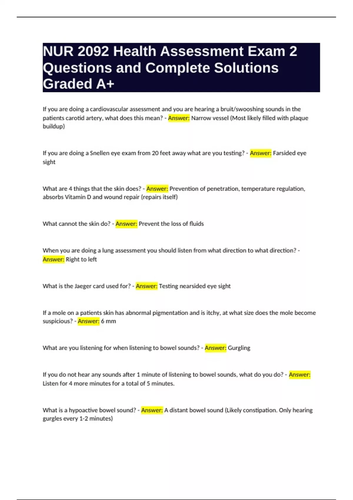 NUR 2092 Health Assessment Exam 2 Questions and Complete Solutions Graded A+