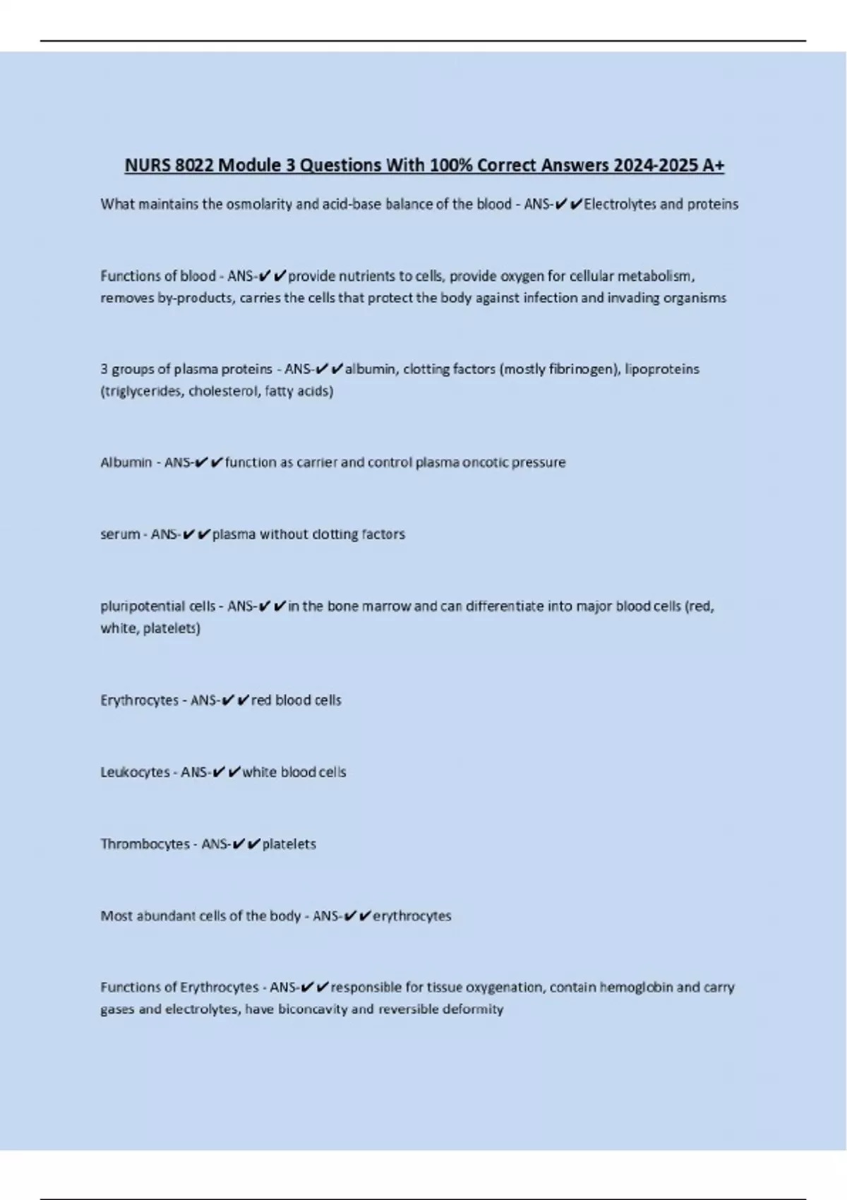NURS 8022 Module 3 Questions With 100% Correct Answers A+ What maintains the osmolarity and acid-base balance of the blood - ANS-Electrolytes and proteins Functions of blood - ANS-provide nutrients to cells, provide oxygen for cellular metabolism, removes by-products, carries the cells that protect the body against infection and invading organisms 3 groups of plasma proteins - ANS-albumin, clotting factors (mostly fibrinogen), lipoproteins (triglycerides, cholesterol, fatty acids) Albumin - ANS-function as carrier and control plasma oncotic pressure serum - ANS-plasma without clotting factors pluripotential cells - ANS-in the bone marrow and can differentiate into major blood cells (red, white, platelets) Erythrocytes - ANS-red blood cells Leukocytes - ANS-white blood cells Thrombocytes - ANS-platelets Most abundant cells of the body - ANS-erythrocytes Functions of Erythrocytes - ANS-responsible for tissue oxygenation, contain hemoglobin and carry gases and electrolytes, have biconcavity and reversible deformity Life cycle of erythrocytes - ANS-...