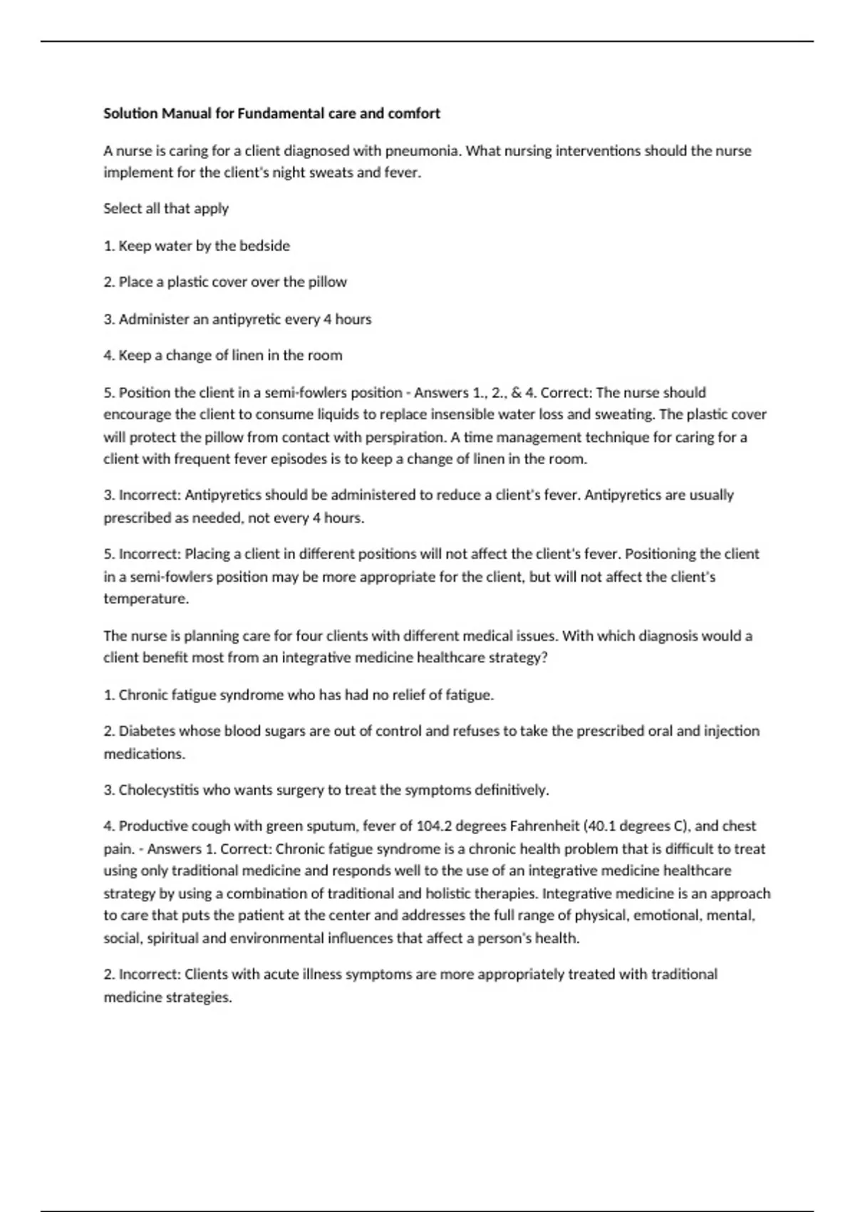 A nurse is caring for a client diagnosed with pneumonia. What nursing interventions should the nurse implement for the client's night sweats and fever. Select all that apply 1. Keep water by the bedside 2. Place a plastic cover over the pillow 3. Administer an antipyretic every 4 hours 4. Keep a change of linen in the room 5. Position the client in a semi-fowlers position - Answers 1., 2., & 4. Correct: The nurse should encourage the client to consume liquids to replace insensible water loss and sweating. The plastic cover will protect the pillow from contact with perspiration. A time management technique for caring for a client with frequent fever episodes is to keep a change of linen in the room. 3. Incorrect: Antipyretics should be administered to reduce a client's fever. Antipyretics are usually prescribed as needed, not every 4 hours. 5. Incorrect: Placing a client in different positions will not affect the client's fever. Positioning the client in a semi-fowlers position may be more appropriate for the client, but will not affect the client's temperature. The nurse is planning care for four clients with different medical issues. With which diagnosis would a client benefit most from an integrative medicine healthcare strategy? 1. Chronic fatigue syndrome who has had no relief of fatigue. 2. Diabetes whose blood sugars are out of control and refuses to take the prescribed oral and injection medications. 3. Cholecystitis who wants surgery to treat the symptoms definitively.
