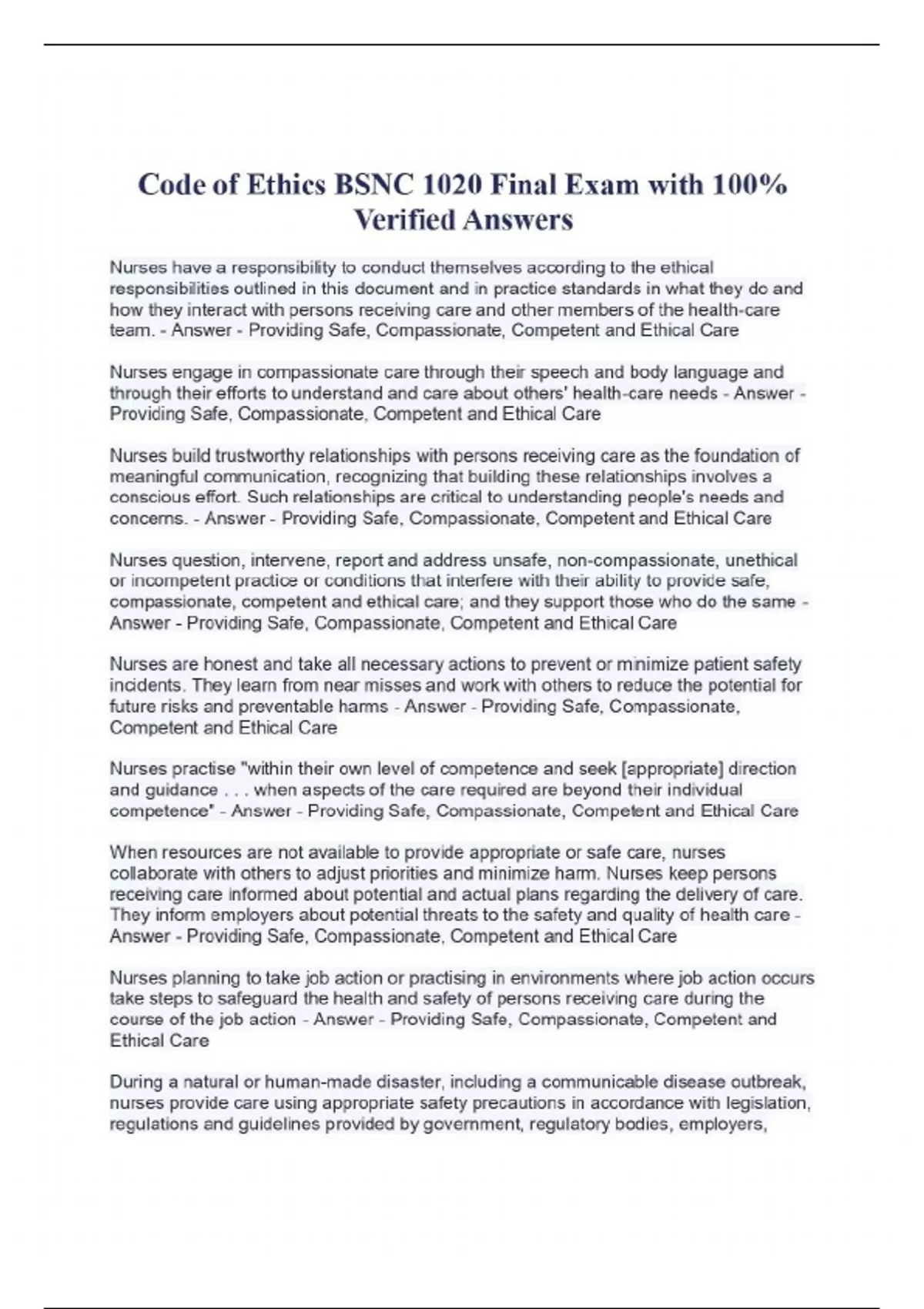 Code of Ethics BSNC 1020 Final Exam with 100% Verified Answers