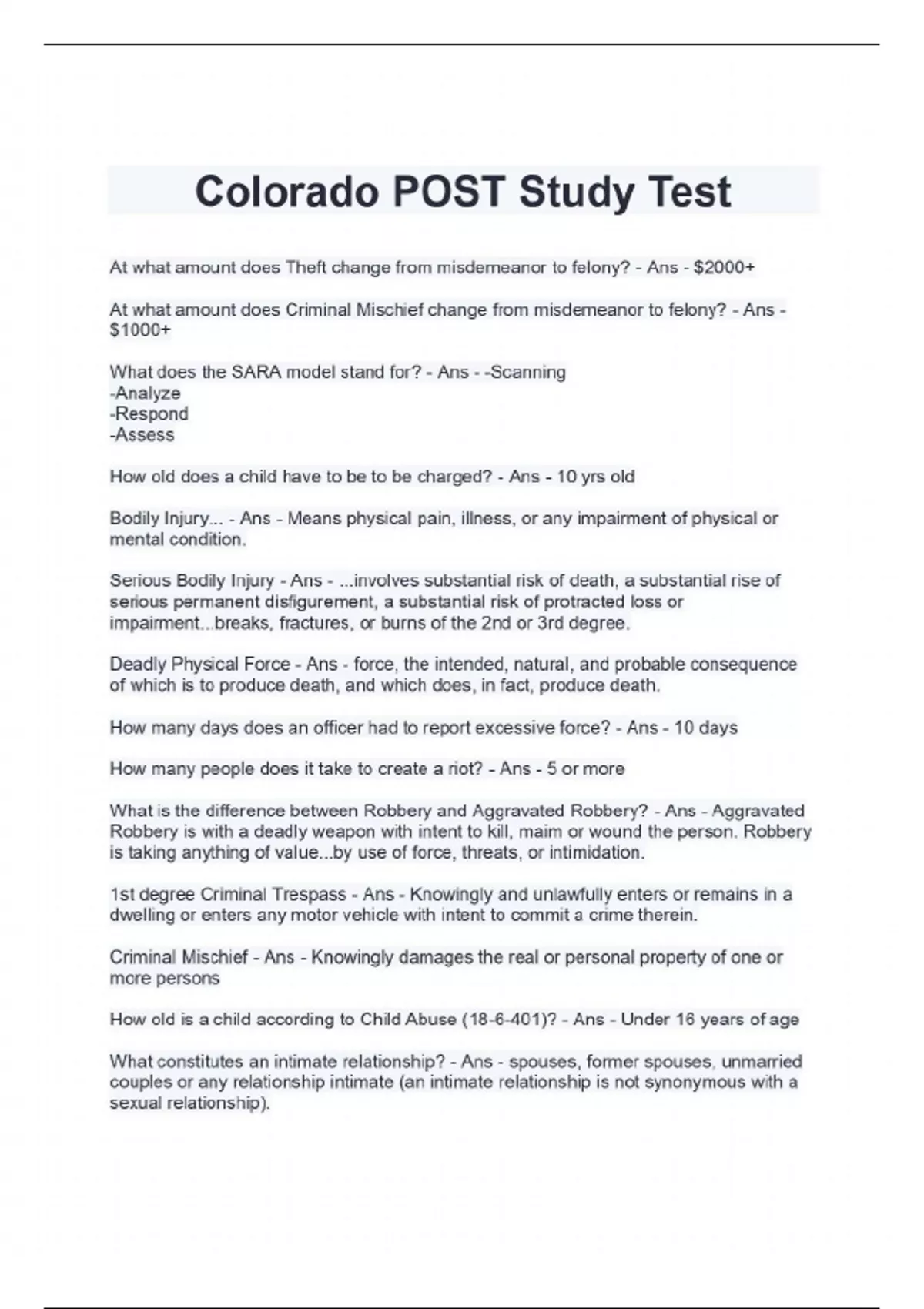 At what amount does Theft change from misdemeanor to felony? - Ans - $2000+ At what amount does Criminal Mischief change from misdemeanor to felony? - Ans - $1000+ What does the SARA model stand for? - Ans - -Scanning -Analyze -Respond -Assess How old does a child have to be to be charged? - Ans - 10 yrs old Bodily Injury... - Ans - Means physical pain, illness, or any impairment of physical or mental condition. Serious Bodily Injury - Ans - ...involves substantial risk of death, a substantial rise of serious permanent disfigurement, a substantial risk of protracted loss or impairment...breaks, fractures, or burns of the 2nd or 3rd degree. Deadly Physical Force - Ans - force, the intended, natural, and probable consequence of which is to produce death, and which does, in fact, produce death. How many days does an officer had to report excessive force? - Ans - 10 days How many people does it take to create a riot? - Ans - 5 or more What is the difference between Robbery and Aggravated Robbery? - Ans - Aggravated Robbery is with a deadly weapon with intent to kill, maim or wound the person. Robbery is taking anything of value...by use of force, threats, or intimidation. 1st degree Criminal Trespass - Ans - Knowingly and unlawfully enters or remains in a dwelling or enters any motor vehicle with intent to commit a crime therein. Criminal Mischief - Ans - Knowingly damages the real or personal property of one or more persons How old is a child according to Child Abuse (18-6-401)? - Ans - Under 16 years of age What constitutes an intimate relationship? - Ans - spouses, former spouses, unmarried couples or any relationship intimate (an intimate relationship is not synonymous with a sexual relationship)