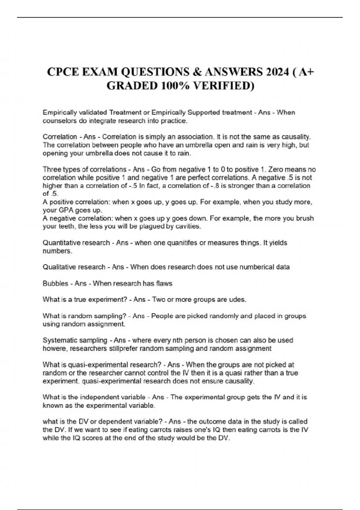 Empirically validated Treatment or Empirically Supported treatment - Ans - When counselors do integrate research into practice. Correlation - Ans - Correlation is simply an association. It is not the same as causality. The correlation between people who have an umbrella open and rain is very high, but opening your umbrella does not cause it to rain. Three types of correlations - Ans - Go from negative 1 to 0 to positive 1. Zero means no correlation while positive 1 and negative 1 are perfect correlations. A negative .5 is not higher than a correlation of -.5 In fact, a correlation of -.8 is stronger than a correlation of .5. A positive correlation: when x goes up, y goes up. For example, when you study more, your GPA goes up. A negative correlation: when x goes up y goes down. For example, the more you brush your teeth, the less you will be plagued by cavities. Quantitative research - Ans - when one quanitifes or measures things. It yields numbers. Qualitative research - Ans - When does research does not use numberical data Bubbles - Ans - When research has flaws What is a true experiment? - Ans - Two or more groups are udes. What is random sampling? - Ans - People are picked randomly and placed in groups using random assignment. Systematic sampling - Ans - where every nth person is chosen can also be used howere, researchers stillprefer random sampling and random assignment What is quasi-experimental research? - Ans - When the groups are not picked at random or the researcher cannot control the IV then it is a quasi rather than a true experiment. quasi-experimental research does not ensure causality. What is the independent variable - Ans - The experimental group gets the IV and it is known as the experimental variable. what is the DV or dependent variable? - Ans - the outcome data in the study is called the DV. If we want to see if eating carrots raises one's IQ then eating carrots is the IV while the IQ scores at the end of the study would be the DV