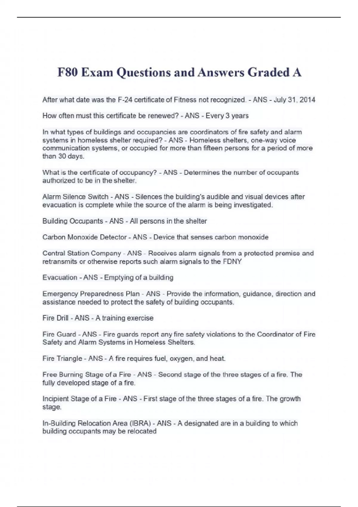 After what date was the F-24 certificate of Fitness not recognized. - ANS - July 31, 2014 How often must this certificate be renewed? - ANS - Every 3 years In what types of buildings and occupancies are coordinators of fire safety and alarm systems in homeless shelter required? - ANS - Homeless shelters, one-way voice communication systems, or occupied for more than fifteen persons for a period of more than 30 days. What is the certificate of occupancy? - ANS - Determines the number of occupants authorized to be in the shelter. Alarm Silence Switch - ANS - Silences the building's audible and visual devices after evacuation is complete while the source of the alarm is being investigated. Building Occupants - ANS - All persons in the shelter Carbon Monoxide Detector - ANS - Device that senses carbon monoxide Central Station Company - ANS - Receives alarm signals from a protected premise and retransmits or otherwise reports such alarm signals to the FDNY Evacuation - ANS - Emptying of a building Emergency Preparedness Plan - ANS - Provide the information, guidance, direction and assistance needed to protect the safety of building occupants. Fire Drill - ANS - A training exercise Fire Guard - ANS - Fire guards report any fire safety violations to the Coordinator of Fire Safety and Alarm Systems in Homeless Shelters. Fire Triangle - ANS - A fire requires fuel, oxygen, and heat. Free Burning Stage of a Fire - ANS - Second stage of the three stages of a fire. The fully developed stage of a fire. Incipient Stage of a Fire - ANS - First stage of the three stages of a fire. The growth stage. In-Building Relocation Area (IBRA) - ANS - A designated are in a building to which building occupants may be relocated