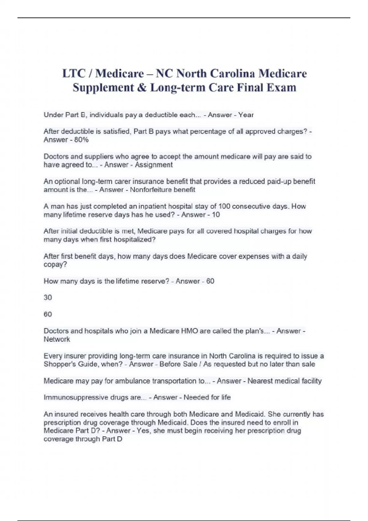 Under Part B, individuals pay a deductible each... - Answer - Year After deductible is satisfied, Part B pays what percentage of all approved charges? - Answer - 80% Doctors and suppliers who agree to accept the amount medicare will pay are said to have agreed to... - Answer - Assignment An optional long-term carer insurance benefit that provides a reduced paid-up benefit amount is the... - Answer - Nonforfeiture benefit A man has just completed an inpatient hospital stay of 100 consecutive days. How many lifetime reserve days has he used? - Answer - 10 After initial deductible is met, Medicare pays for all covered hospital charges for how many days when first hospitalized? After first benefit days, how many days does Medicare cover expenses with a daily copay? How many days is the lifetime reserve? - Answer - 60 30 60 Doctors and hospitals who join a Medicare HMO are called the plan's... - Answer - Network Every insurer providing long-term care insurance in North Carolina is required to issue a Shopper's Guide, when? - Answer - Before Sale / As requested but no later than sale Medicare may pay for ambulance transportation to... - Answer - Nearest medical facility Immunosuppressive drugs are... - Answer - Needed for life An insured receives health care through both Medicare and Medicaid. She currently has prescription drug coverage through Medicaid. Does the insured need to enroll in Medicare Part D? - Answer
