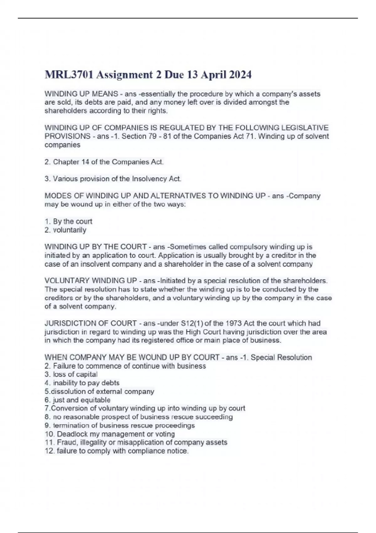 WINDING UP MEANS - ans -essentially the procedure by which a company's assets are sold, its debts are paid, and any money left over is divided amongst the shareholders according to their rights. WINDING UP OF COMPANIES IS REGULATED BY THE FOLLOWING LEGISLATIVE PROVISIONS - ans -1. Section 79 - 81 of the Companies Act 71. Winding up of solvent companies 2. Chapter 14 of the Companies Act. 3. Various provision of the Insolvency Act. MODES OF WINDING UP AND ALTERNATIVES TO WINDING UP - ans -Company may be wound up in either of the two ways: 1. By the court 2. voluntarily WINDING UP BY THE COURT - ans -Sometimes called compulsory winding up is initiated by an application to court. Application is usually brought by a creditor in the case of an insolvent company and a shareholder in the case of a solvent company VOLUNTARY WINDING UP - ans -Initiated by a special resolution of the shareholders. The special resolution has to state whether the winding up is to be conducted by the creditors or by the shareholders, and a voluntary winding up by the company in the case of a solvent company. JURISDICTION OF COURT - ans -under S12(1) of the 1973 Act the court which had jurisdiction in regard to winding up was the High Court having jurisdiction over the area in which the company had its registered office or main place of business. WHEN COMPANY MAY BE WOUND UP BY COURT - ans -1. Special Resolution 2. Failure to commence of continue with business 3. loss of capital 4. inability to pay debts lution of external company 6. just and equitable 7.Conversion of voluntary winding up into winding up by court 8. no reasonable prospect of business rescue succeeding 9. termination of business rescue proceedings 10. Deadlock my management or voting 11. Fraud, illegality or misapplication of company assets 12. failure to comply with compliance notice