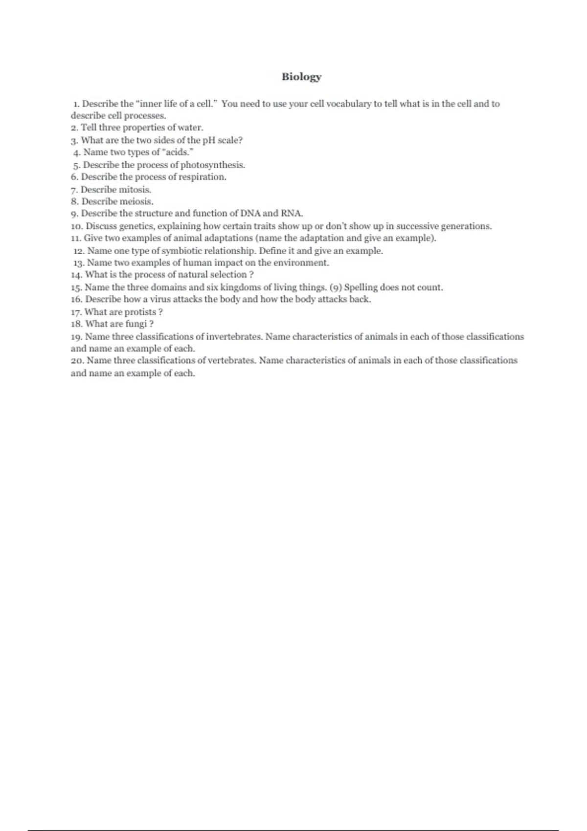 20. Name three classifications of vertebrates. Name characteristics of animals in each of those classifications