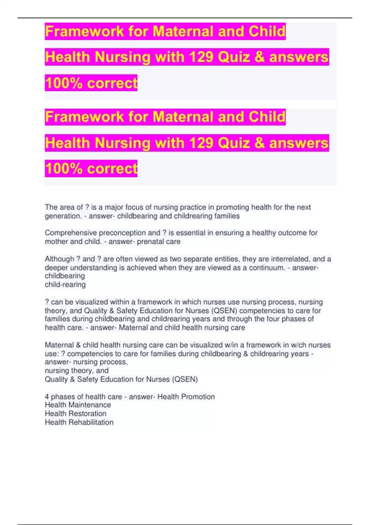 Framework for Maternal and Child Health Nursing with 129 Quiz & answers 100% correct