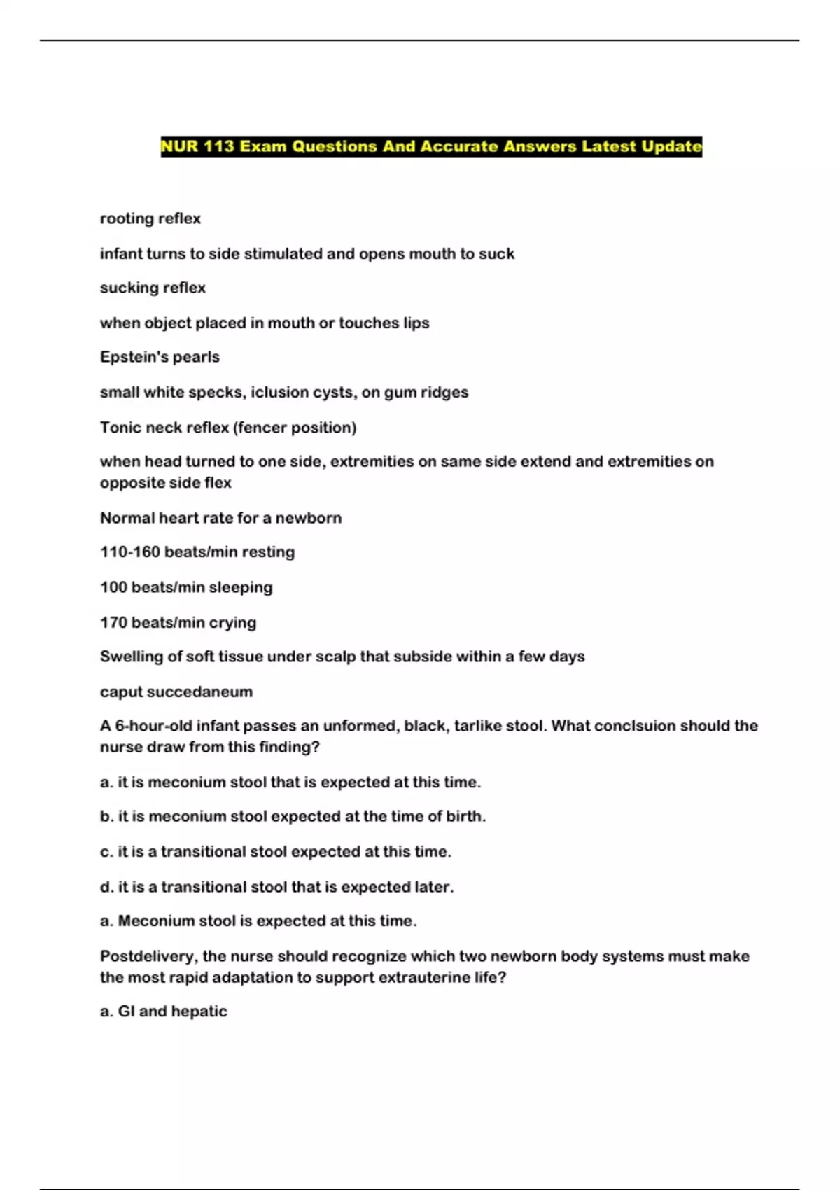 NUR 113 Exam Questions And Accurate Answers Latest Update