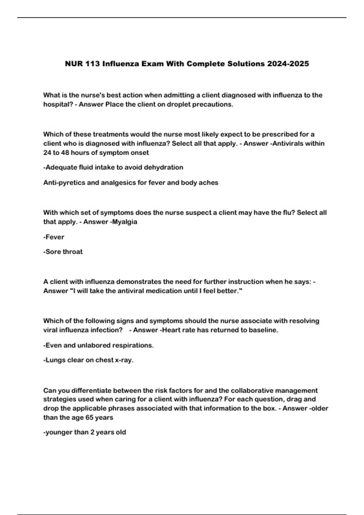 NUR 113 Influenza Exam With Complete Solutions 2024-2025