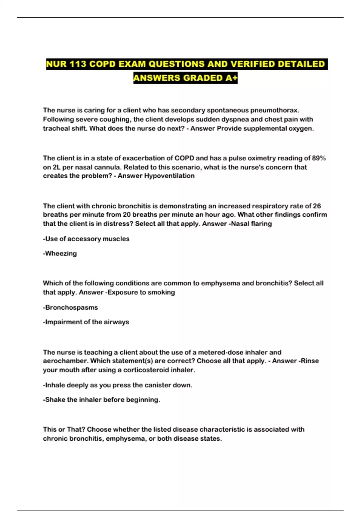 NUR 113 COPD EXAM QUESTIONS AND VERIFIED DETAILED